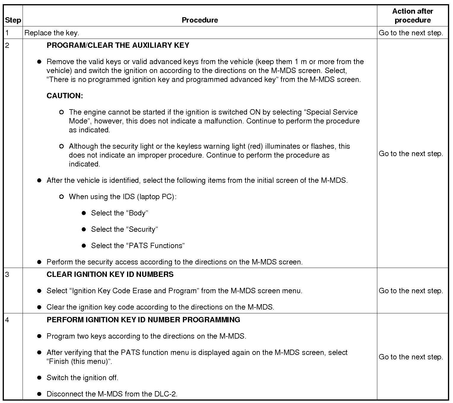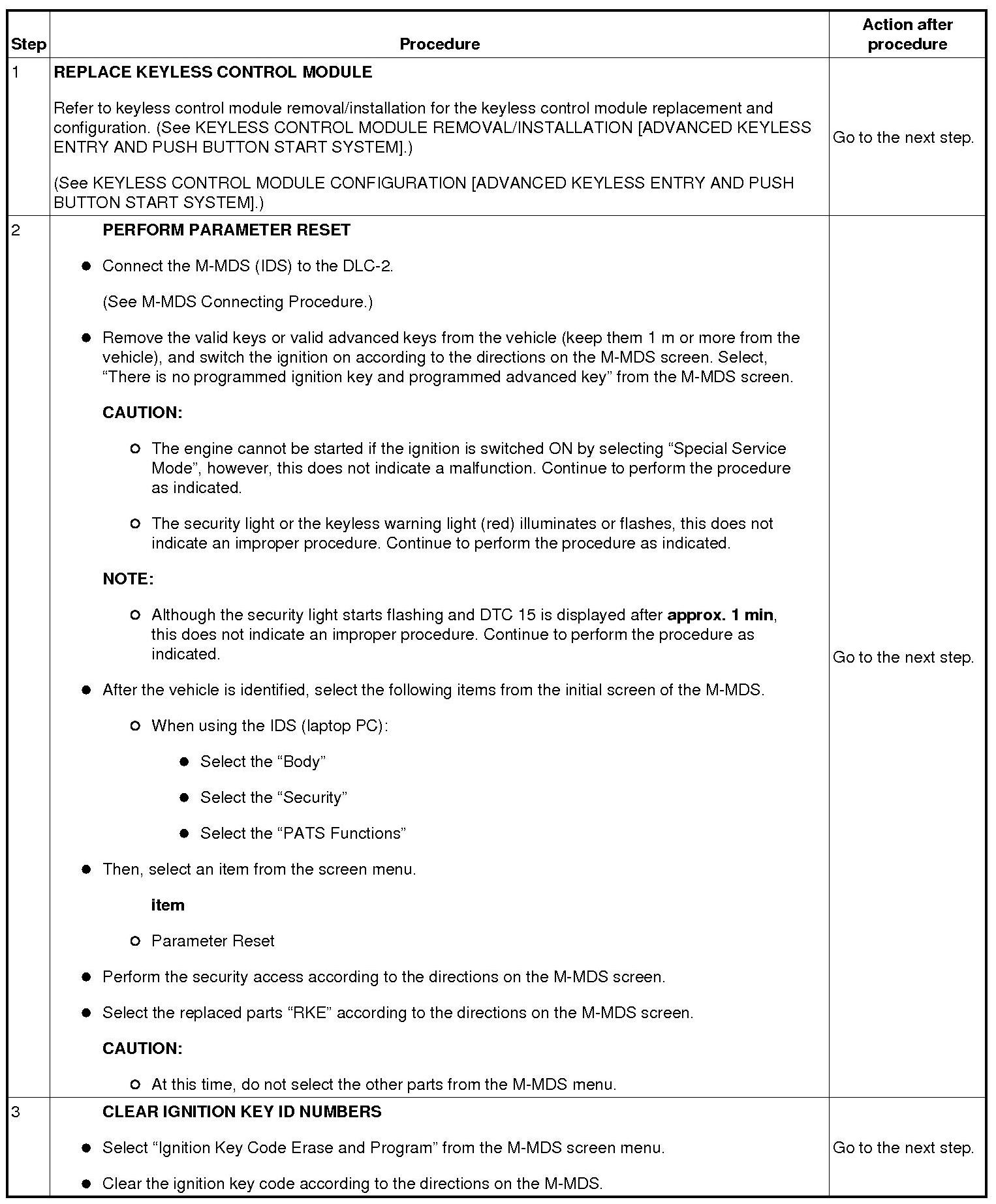 - When replacing the keyless control module or the steering lock, remove the valid keys or valid advanced keys from the vehicle (keep them 1 m or more from the vehicle) and switch the ignition on according to the directions on the M-MDS screen. Select, "There is no programmed ignition key and programmed advanced key" from the M-MDS screen.