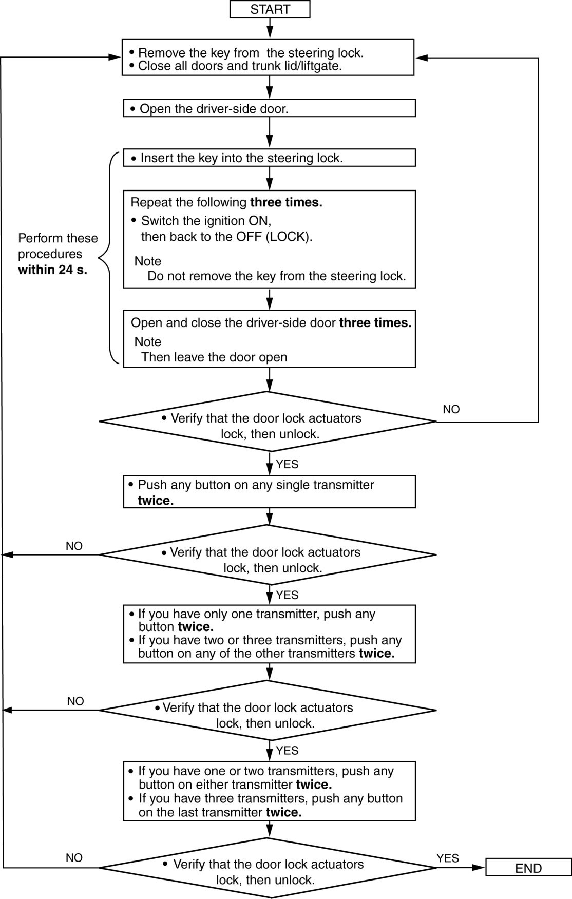 - After completing the work, remove the key from the steering lock and verify that all the door lock/unlock operation using the transmitter is correct.