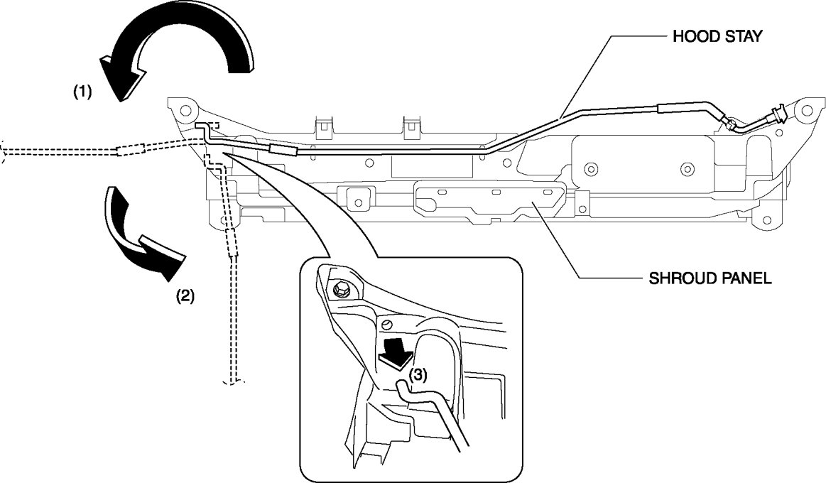 3. Rotate the hood stay in the direction of the arrow (1),(2), then remove the hood stay in the direction or the arrow (3).