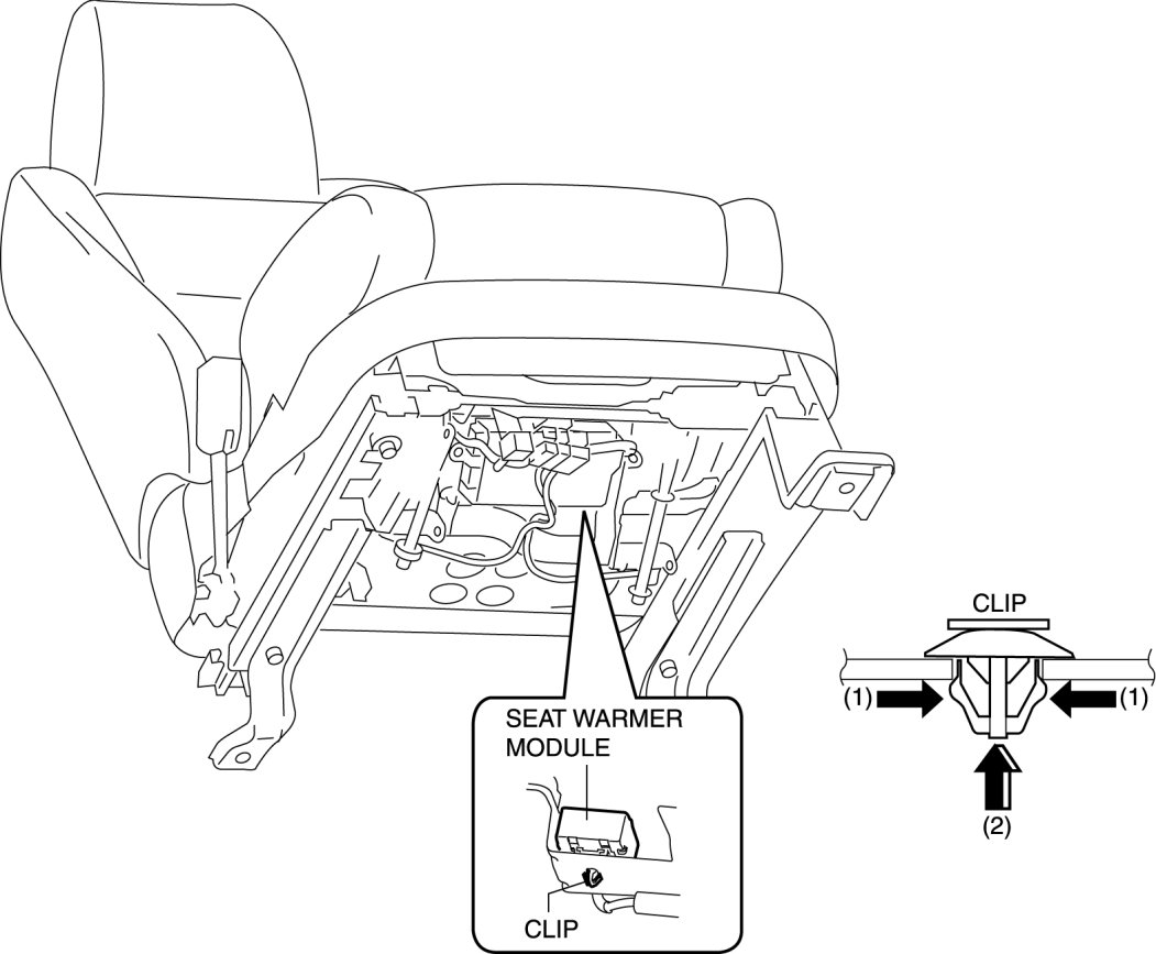 3. Detach the clip by squeezing it at the positions indicated by the arrows (1) shown in the figure, and press the clip in the direction of the arrow (2) to remove the seat warmer module.