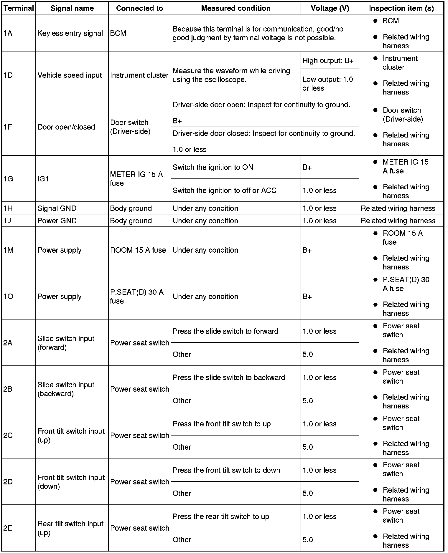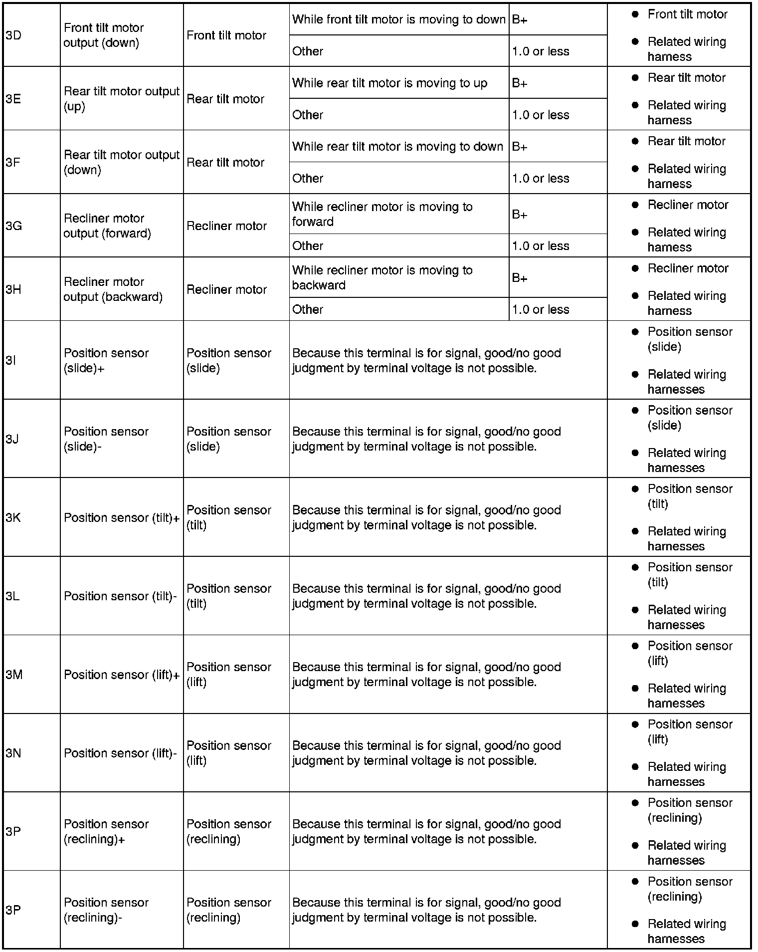 - If the voltage is not as specified in the Terminal Voltage (Reference), inspect the parts under "Inspection item (s)" and related wiring harnesses.