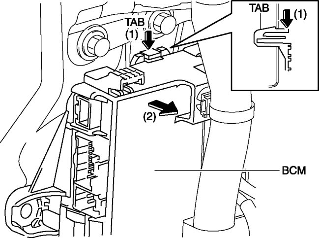 10. Press the BCM tab in the direction of the arrow (1) shown in the figure while pulling it in the direction of the arrow (2), and then remove the tab from the body.