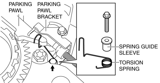 - Install the torsion spring to the position of the parking pawl and parking pawl bracket shown in the figure together with the spring guide sleeve and torsion spring installed.