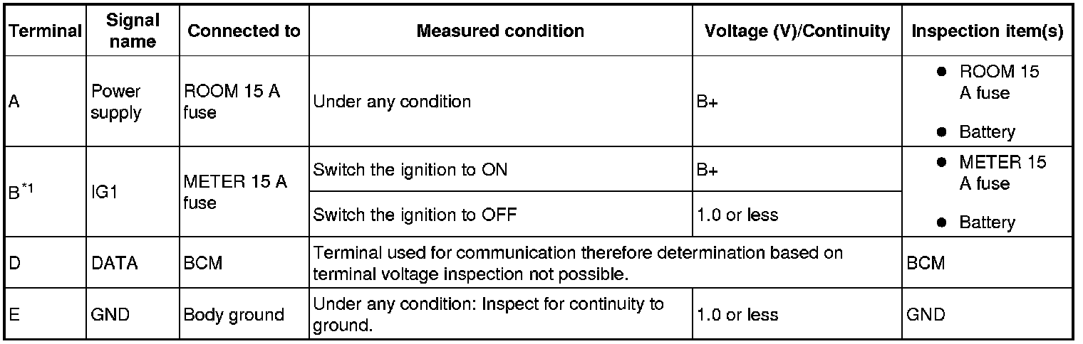 1. Measure the voltage or inspect for continuity according to the Terminal Voltage Table (Reference).