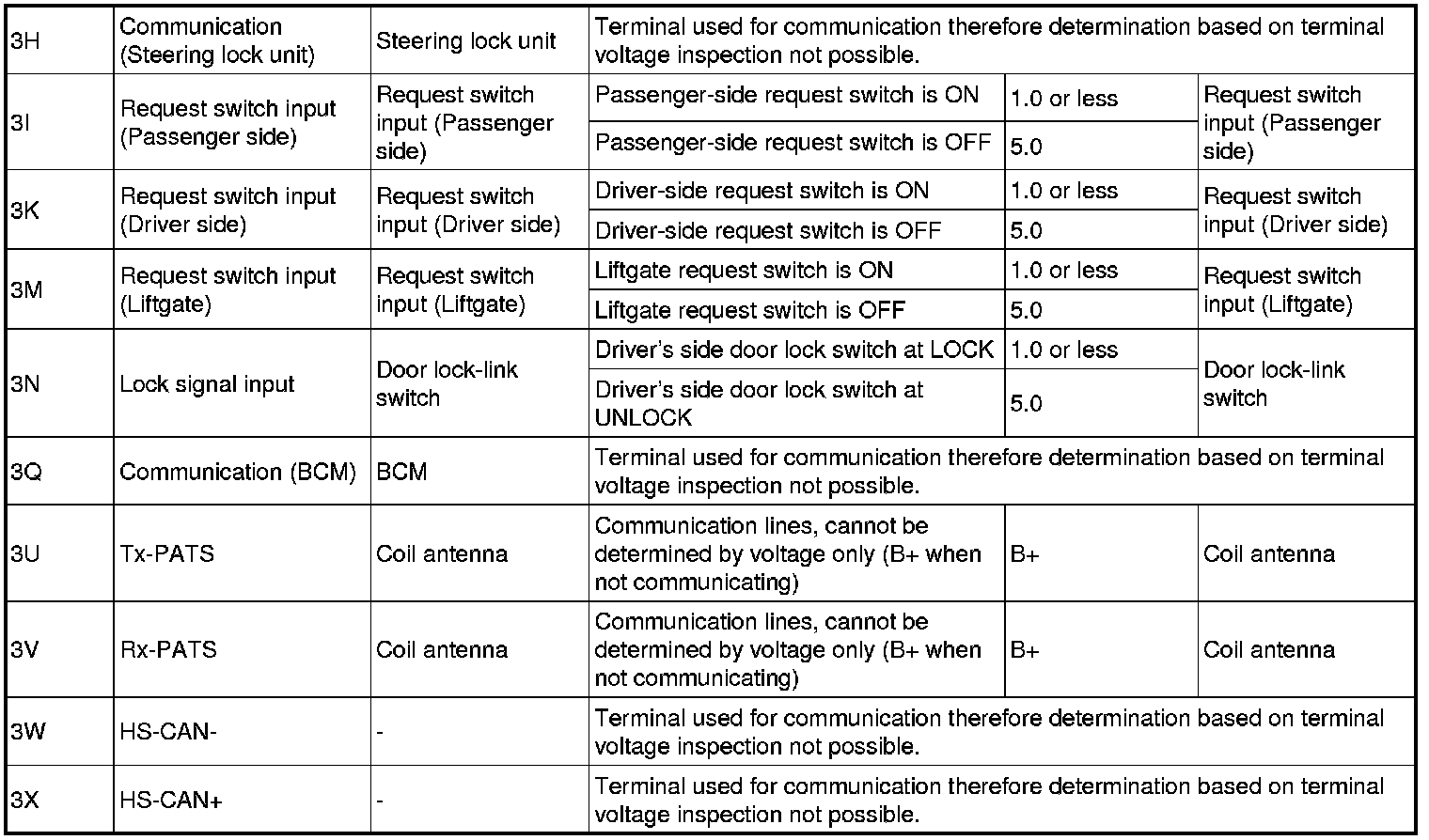 - If the voltage is not as specified in the Terminal Voltage Table (Reference), inspect the parts under "Inspection item(s)" and related wiring harnesses.