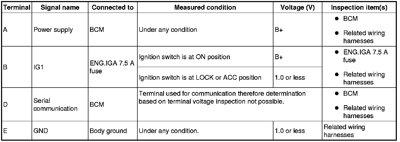 Measure the voltage at the auto light/wiper control module terminals as indicated below.