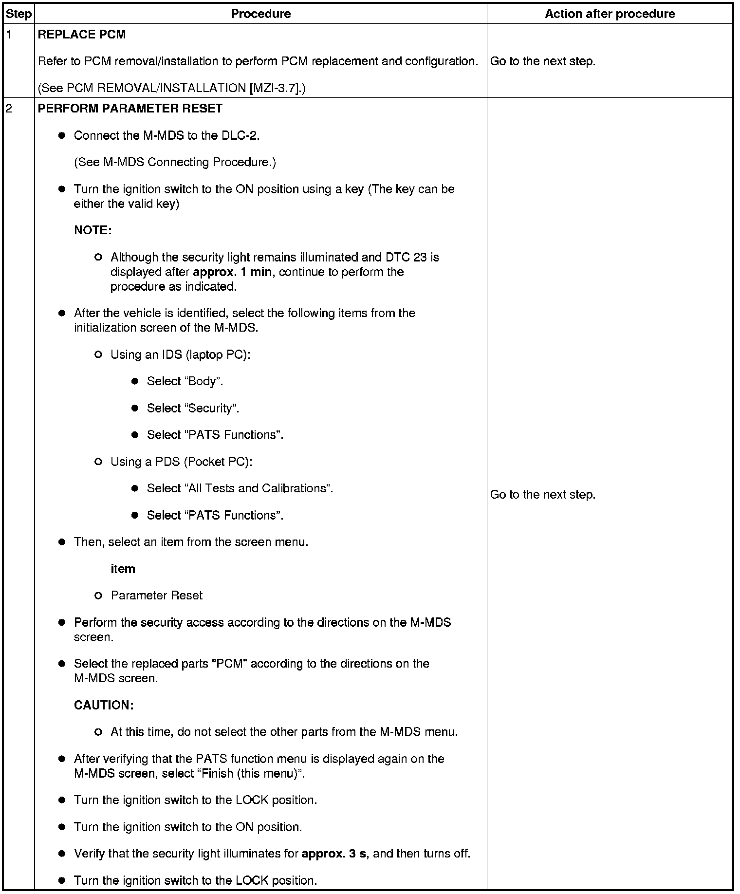 Immobilizer System-Related Parts Service and Programming Procedure Table