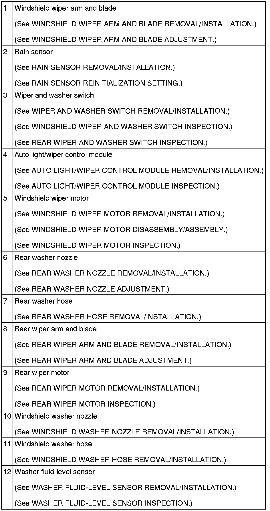WIPER/WASHER SYSTEM LOCATION INDEX