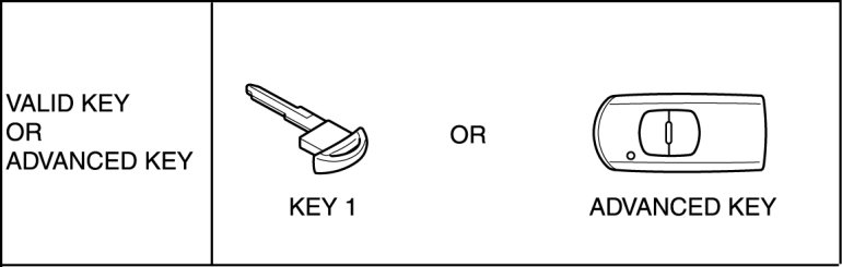 - The "Valid key" or "Valid advanced key" referred to in this information indicates the key that can start the engine.
