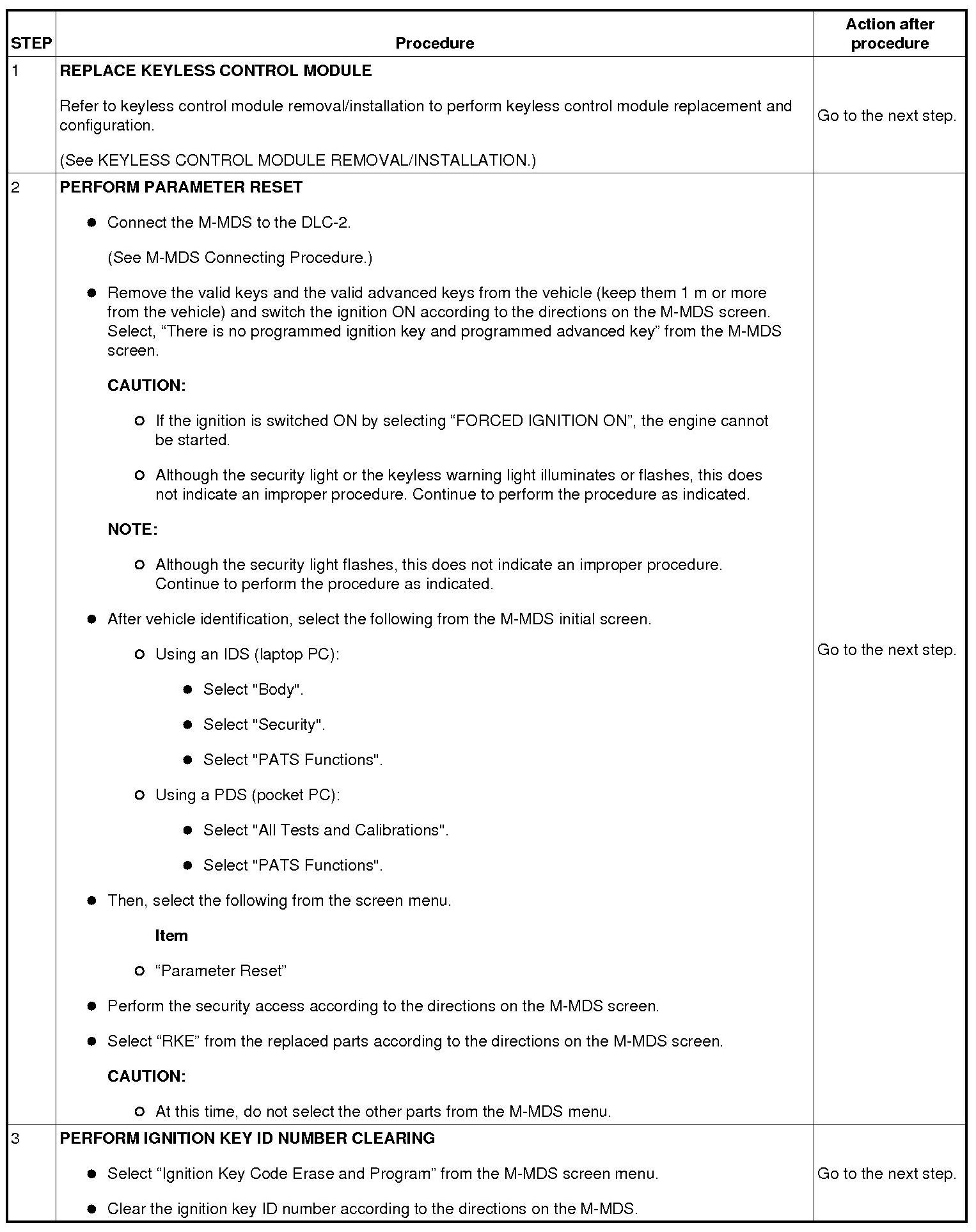 - When replacing the keyless control module, remove the valid keys and the valid advanced keys from the vehicle (keep them 1 m or more from the vehicle) and switch the ignition ON according to the directions on the M-MDS screen. Select, "There is no programmed ignition key and programmed advanced key" from the M-MDS screen.