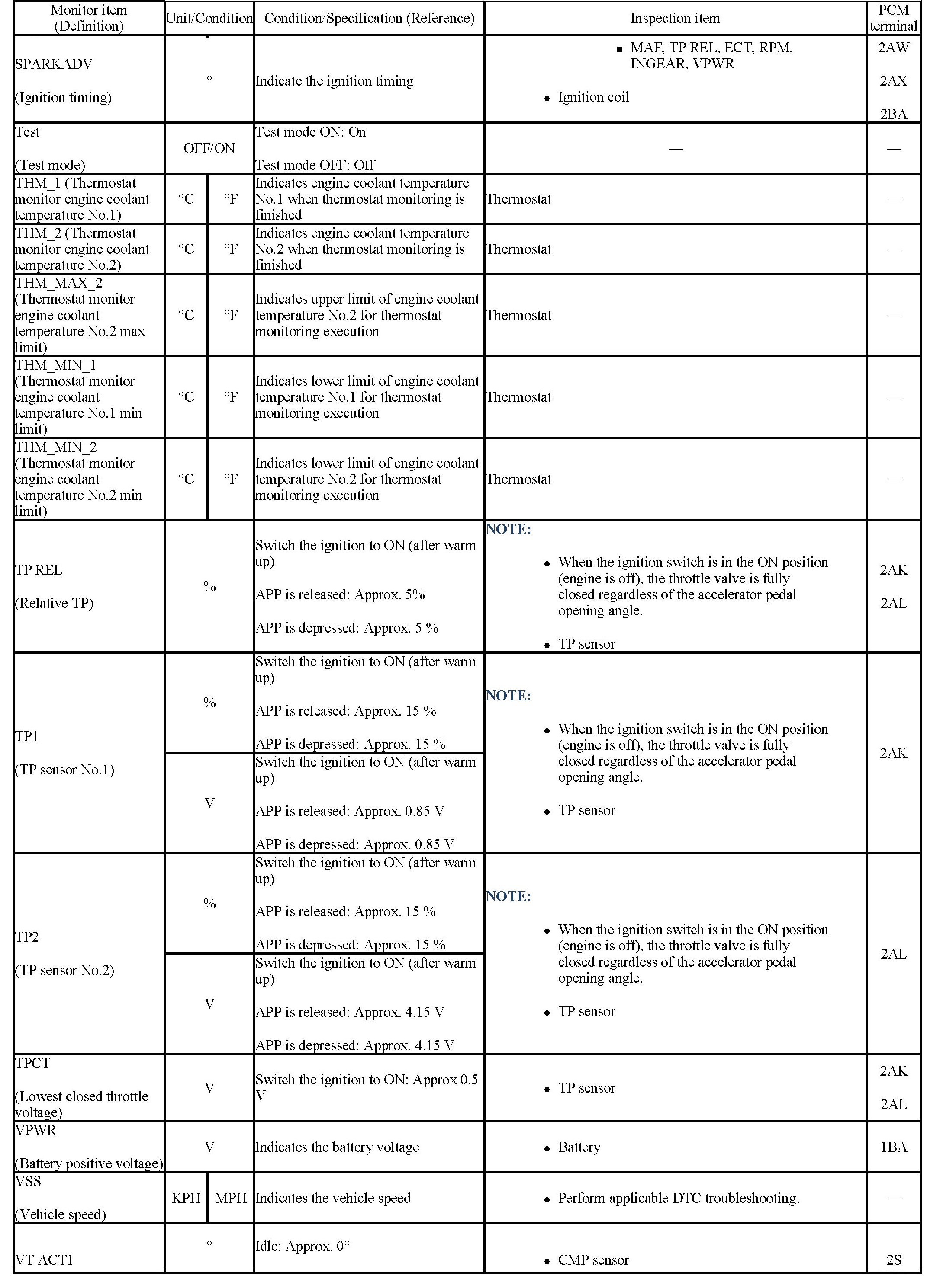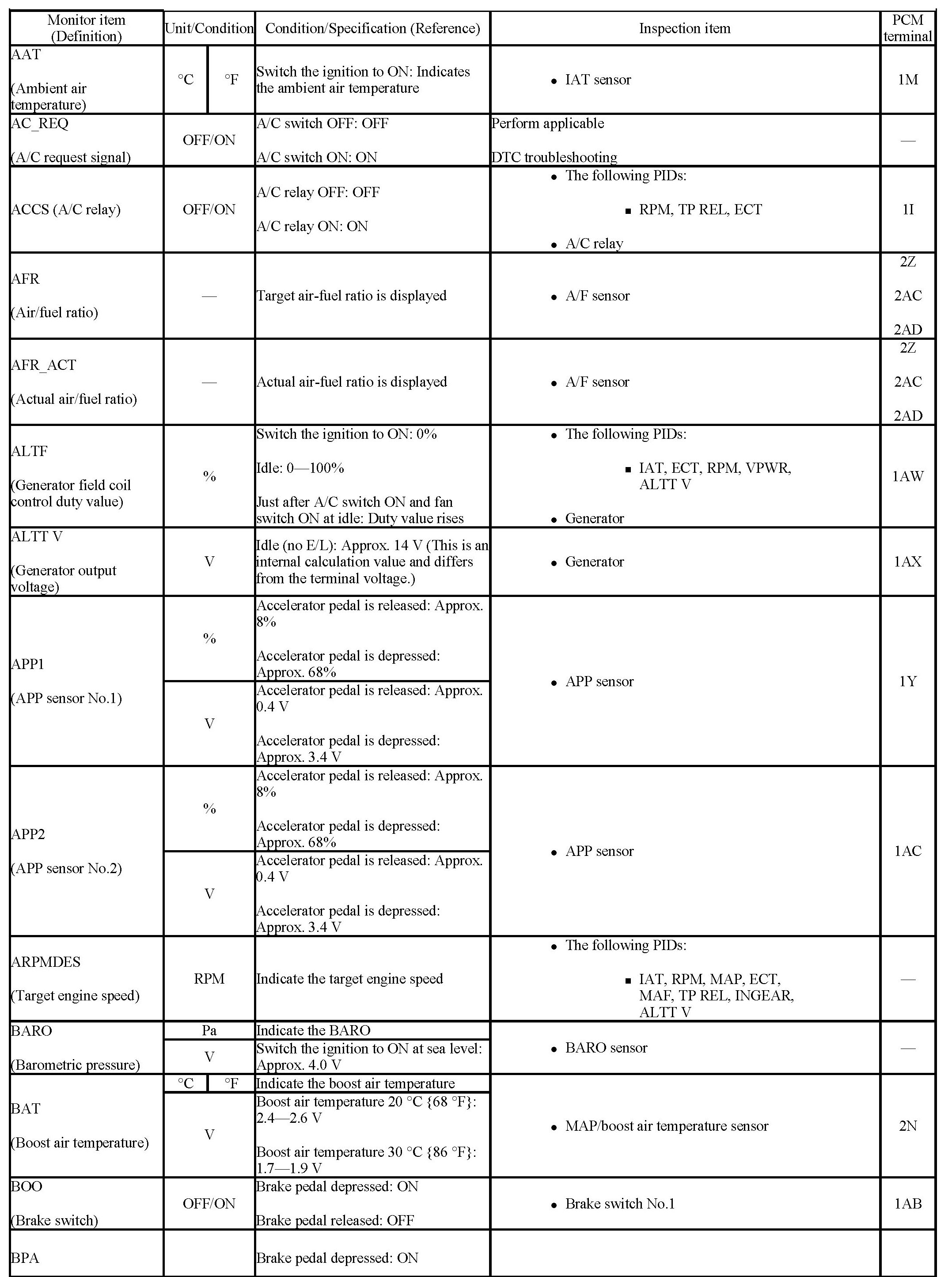 - If PID value is not within the specification, follow the instructions in the "Inspection item" column.