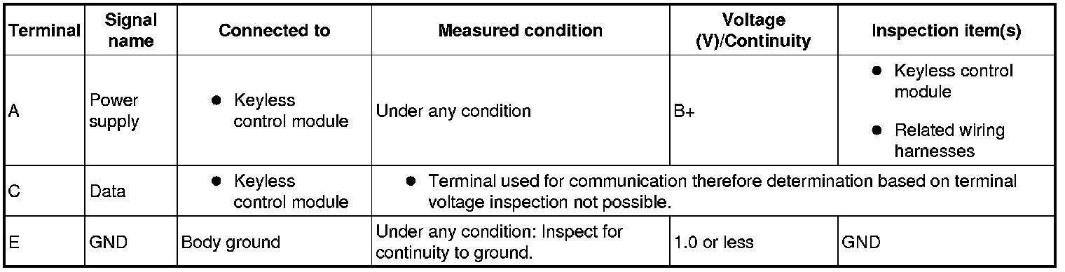 1. Measure the voltage or inspect for continuity according to the Terminal Voltage Table (Reference).