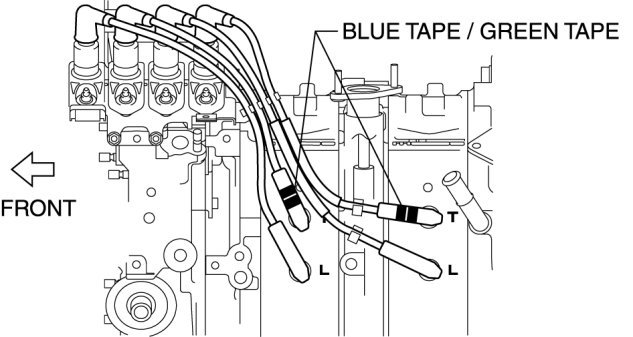 1 Install the high-tension lead with blue and green tape on the trailing side.