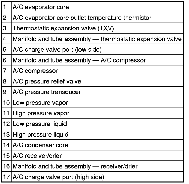 During stabilized conditions (air conditioning system shutdown), the refrigerant is in a vaporized state and pressures are equal throughout the system. When the A/C compressor is in operation it increases pressure on the refrigerant vapor, raising its temperature. The high-pressure and high-temperature vapor is then released into the top of the condenser core.The condenser core, being close to ambient temperature, causes the refrigerant vapor to condense into a liquid when heat is removed from the refrigerant by ambient air passing over the fins and tubing. The now liquid refrigerant, still at high pressure, exits from the bottom of the condenser core and enters the inlet side of the evaporator core orifice.The evaporator core orifice is the restriction in the refrigerant system that creates the low pressure drop in the evaporator core and separates the high and low pressure sides of the A/C system. As the liquid refrigerant leaves this restriction, its pressure and boiling point are reduced.The liquid refrigerant is now at its lowest pressure and temperature. As it passes through the evaporator core, it absorbs heat from the passenger compartment airflow passing over the plate/fin sections of the evaporator core. This addition of heat causes the refrigerant to boil (convert to gas). The now cooler passenger compartment air can no longer support the same humidity level of the warmer air and this excess moisture condenses on the exterior of the evaporator coils and fins and drains outside the vehicle.The suction accumulator is designed to remove moisture from the refrigerant and to prevent any liquid refrigerant that may not have been vaporized in the evaporator core from reaching the A/C compressor. The A/C compressor is designed to pump refrigerant vapor only, as liquid refrigerant will not compress and can damage the A/C compressor.
