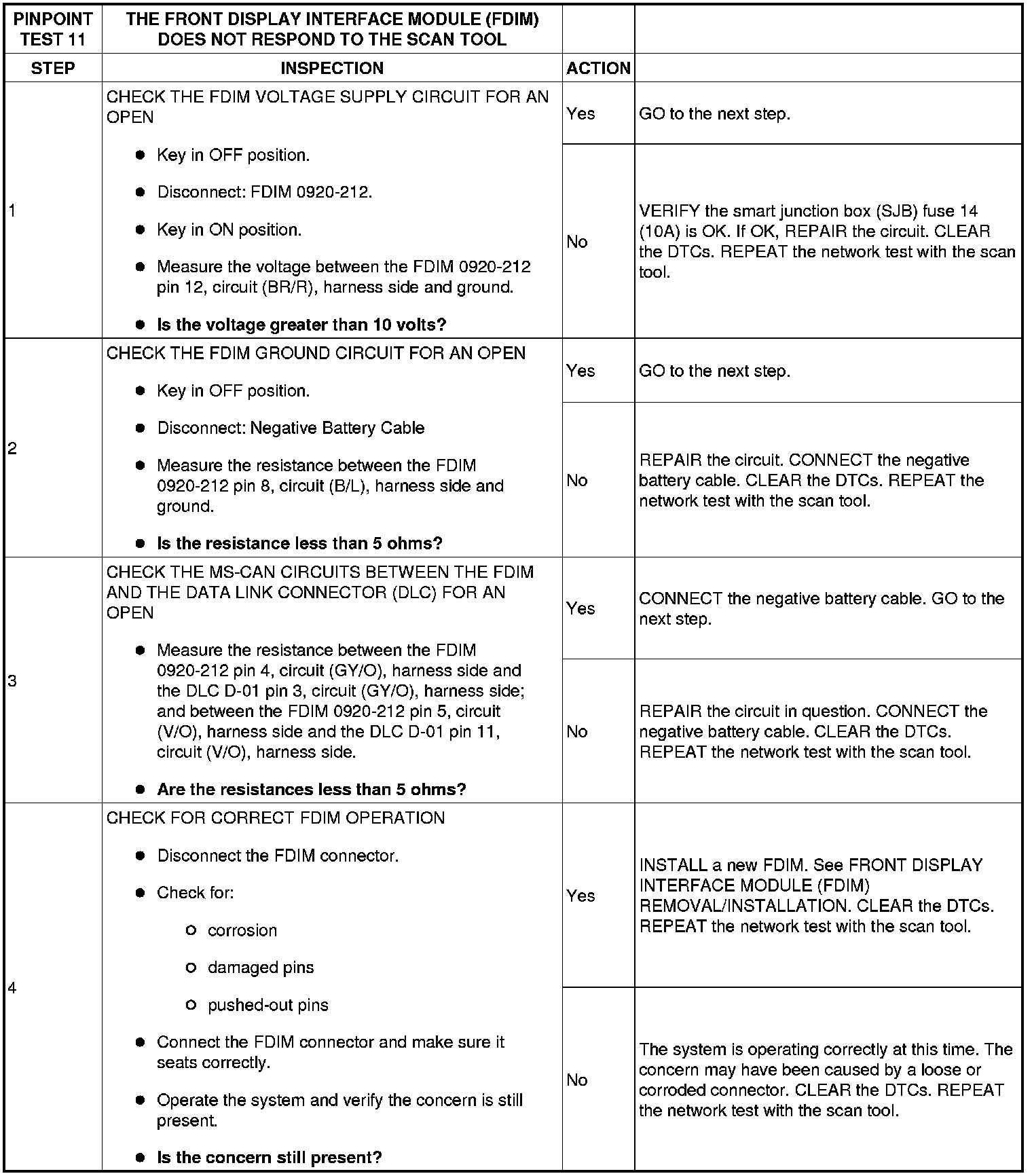 Pinpoint Test 11: The Front Display Interface Module (FDIM) Does Not Respond To The Scan Tool