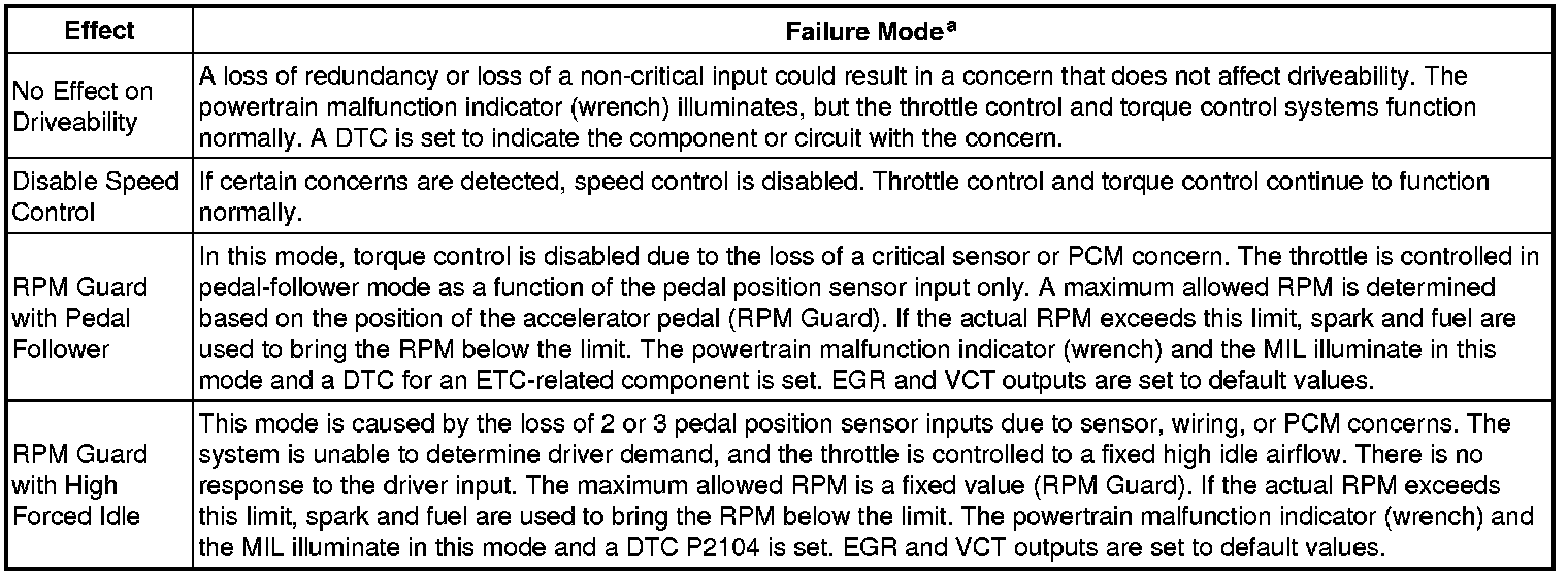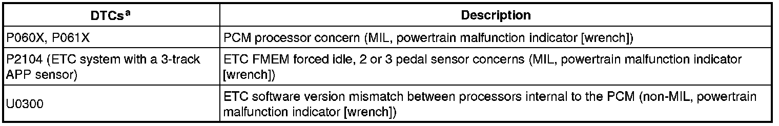 a For all DTCs, in addition to the MIL, the powertrain malfunction indicator (wrench) is on for the concern that caused the FMEM action. Monitor execution is continuous. Monitor false detection duration is less than 5 seconds to register a concern.