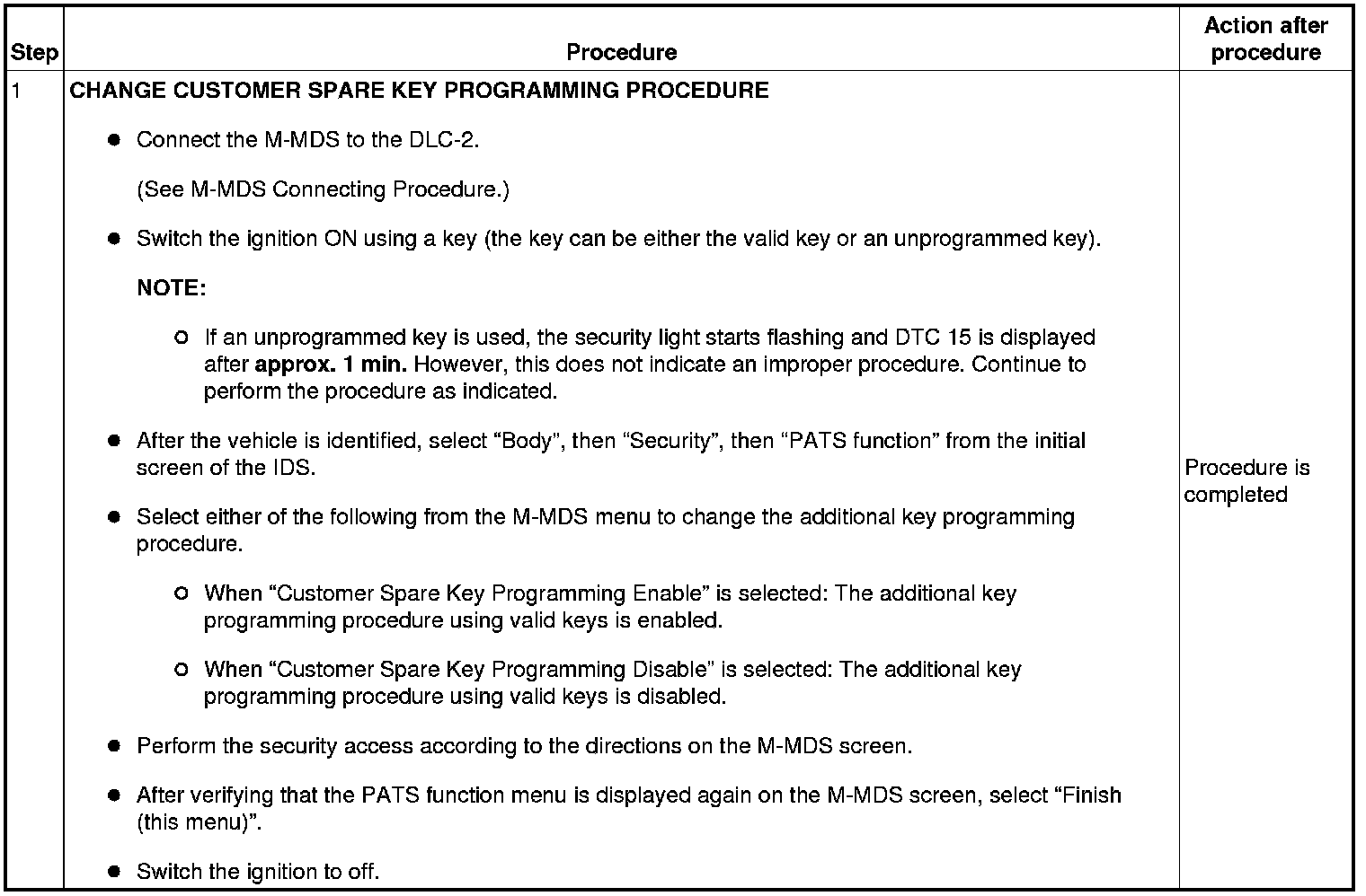 Immobilizer System-Related Parts Service and Programming Procedure Table