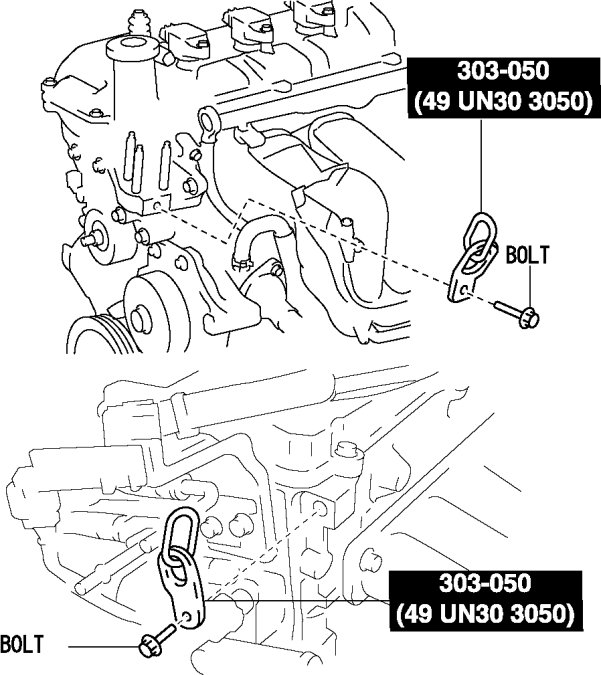 2. Using the bolts part number 99794 1025 or M10x1.25, length 25 mm {0.99 in} to install the SST to the position shown in the figure, hang the engine and transaxle, and then take it down from the engine jack.