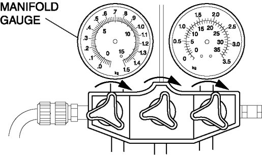 4. When the low-pressure side reading increases to 0.098 MPa {1.0 kgf/cm2, 14 psi}, close the high-pressure side valve of the manifold gauge.
