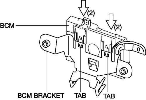 6. Pull the BCM in the direction of the arrow (2) as shown in the figure and remove the BCM bracket.
