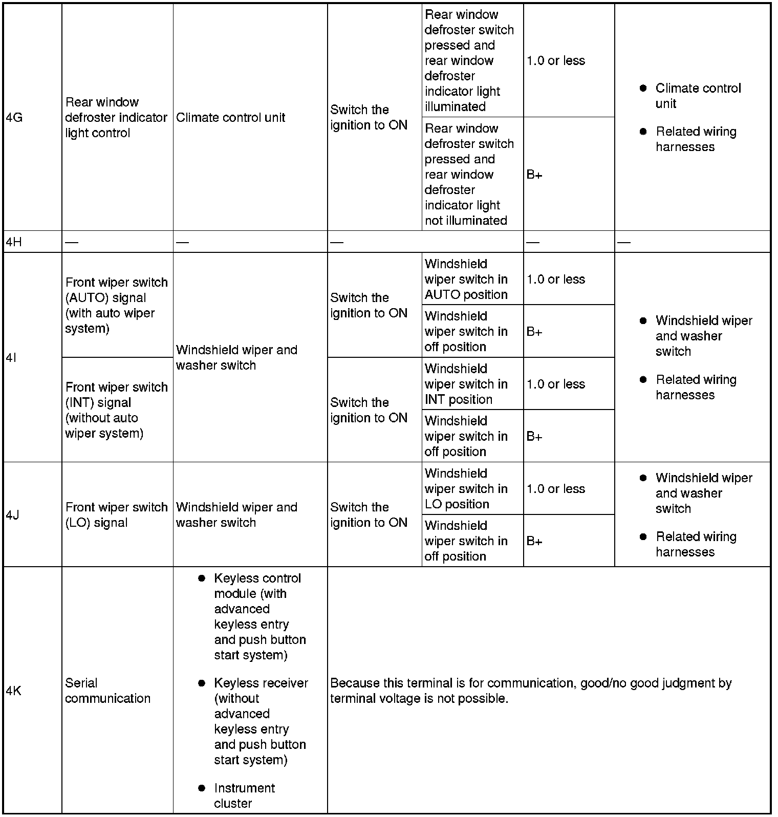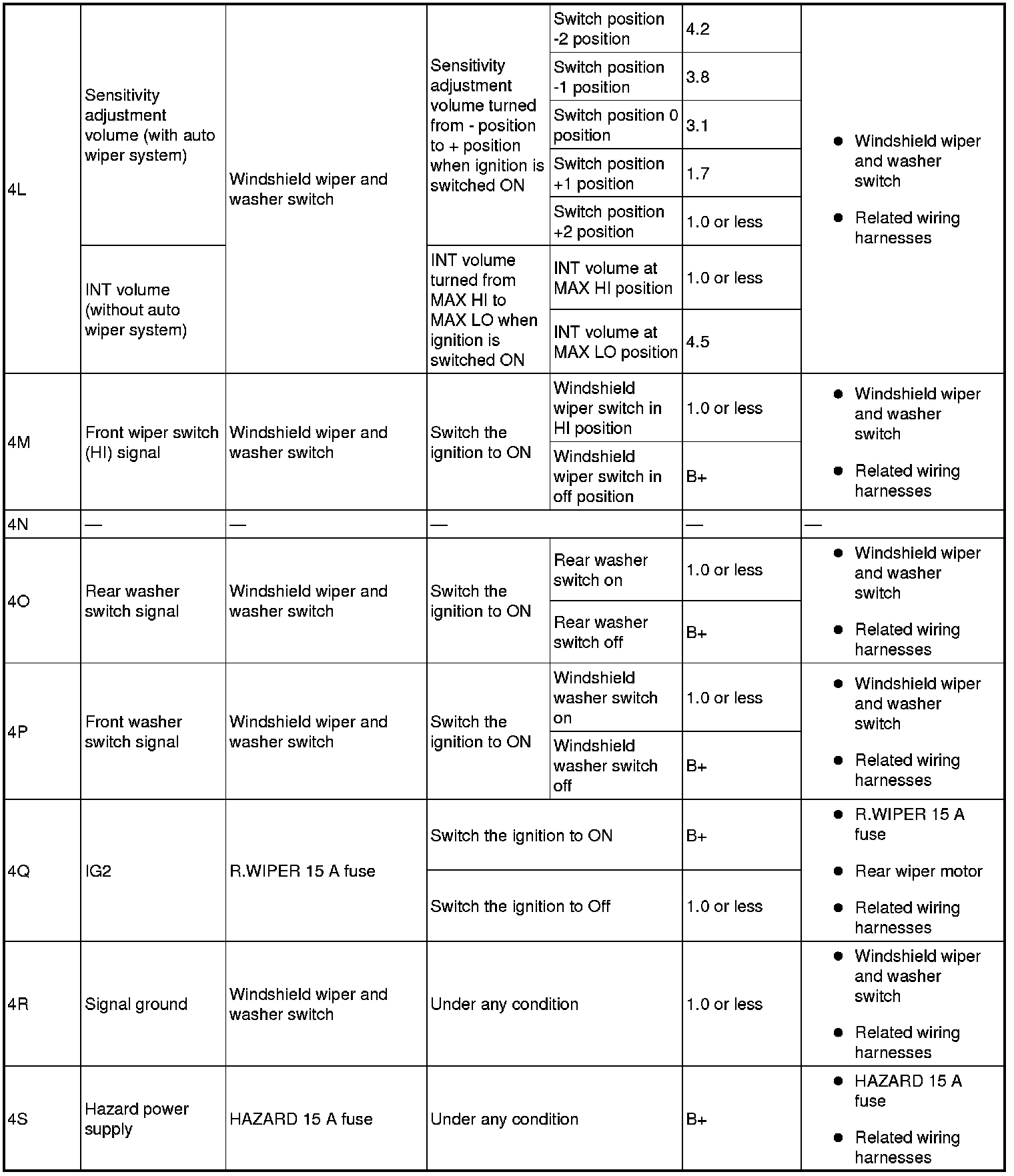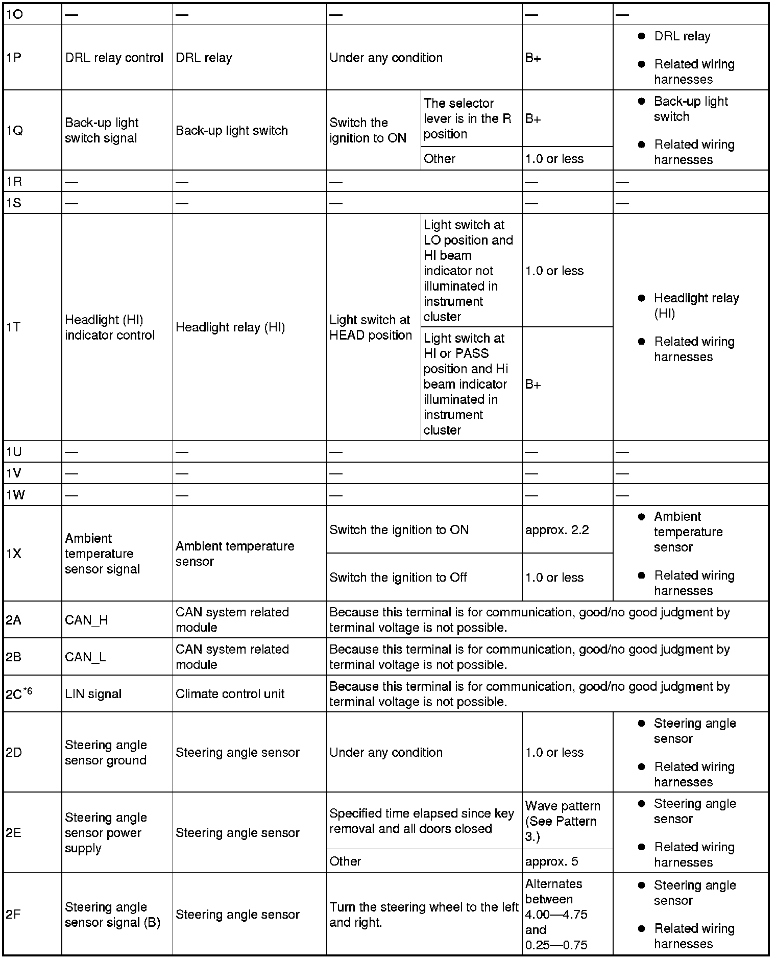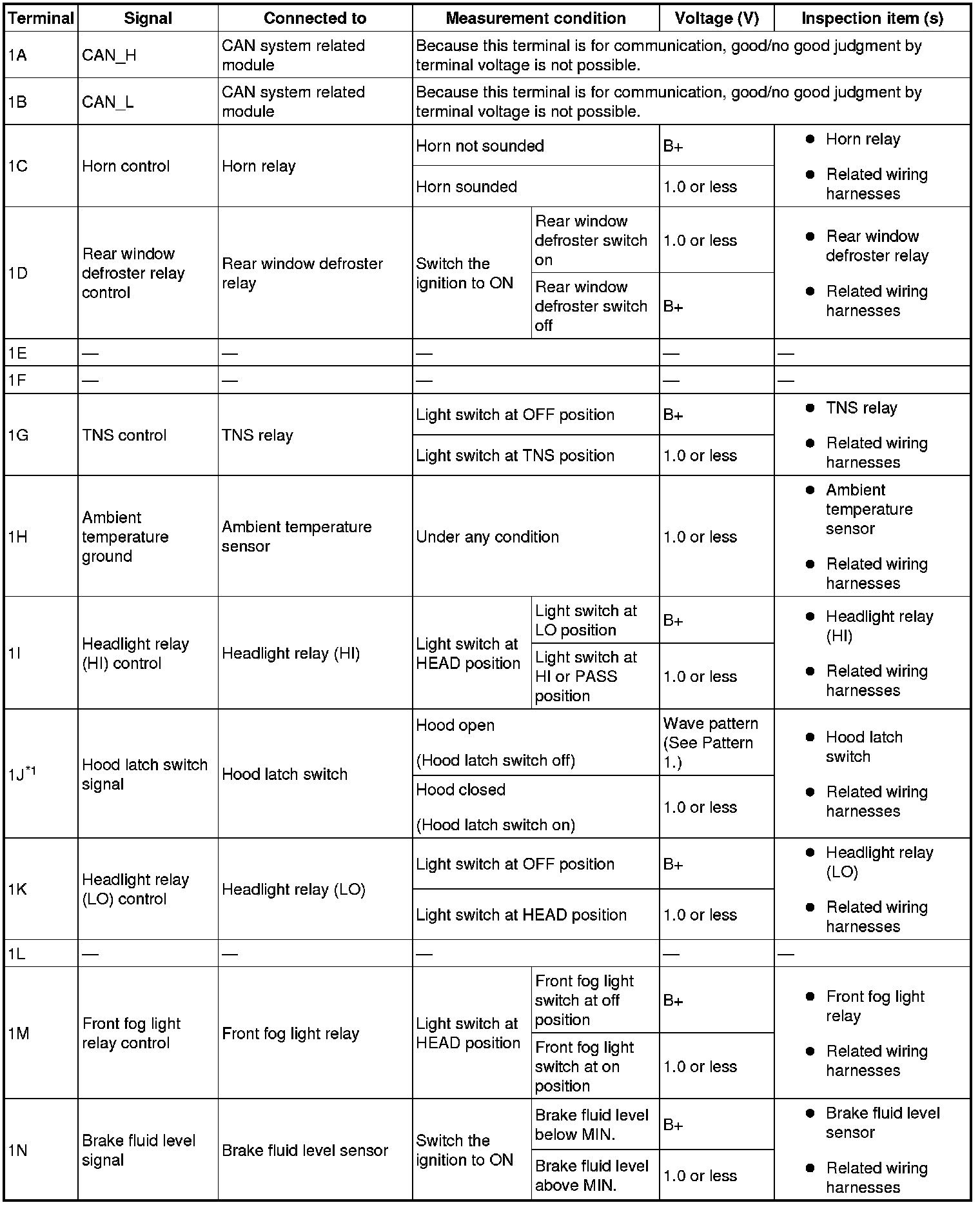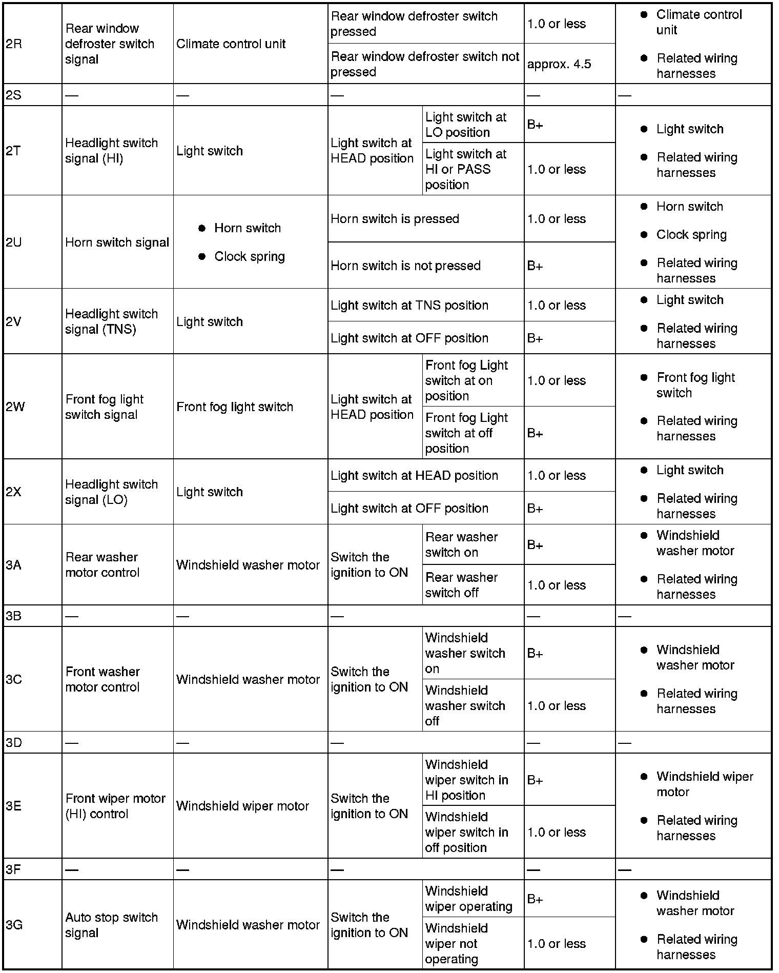 - If the voltage or continuity is not as specified in the Terminal Voltage Table, inspect the parts under "Inspection item (s)".