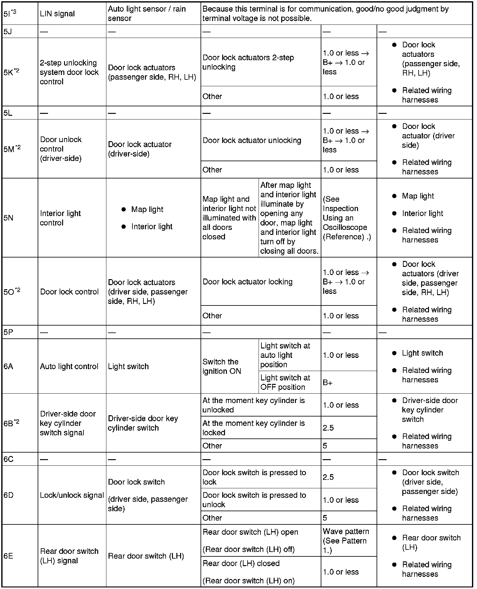 - Lock/unlock input (passenger-side door lock-link switch) (rear door lock link switch (RH, LH)): 6J (+) -> body ground (-)
