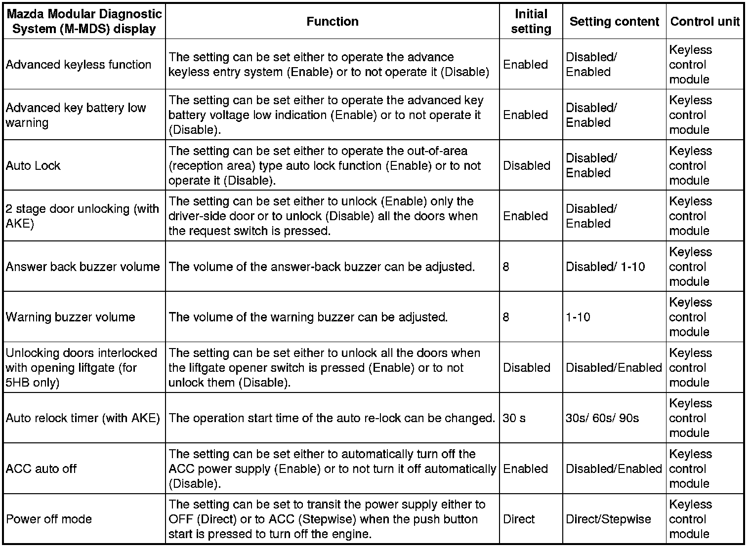 - For the keyless entry system, refer to the control system personalization features setting. Control System Personalization Features Setting Procedure