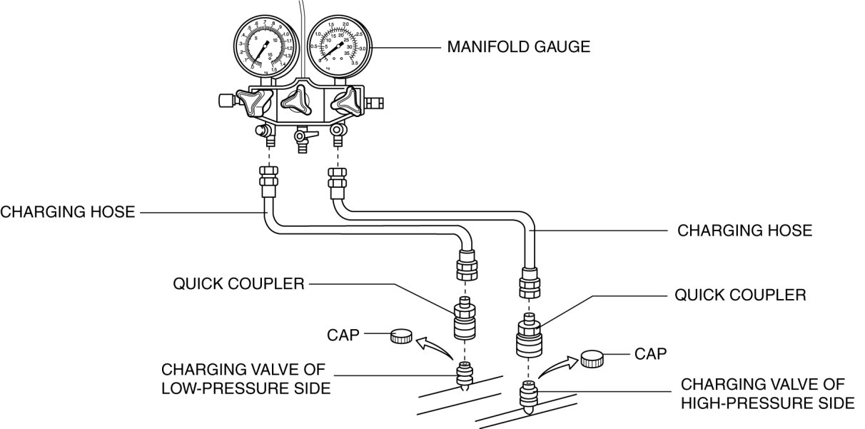 2. Connect the charging hoses to the high- and low-pressure side joints of the manifold gauge.