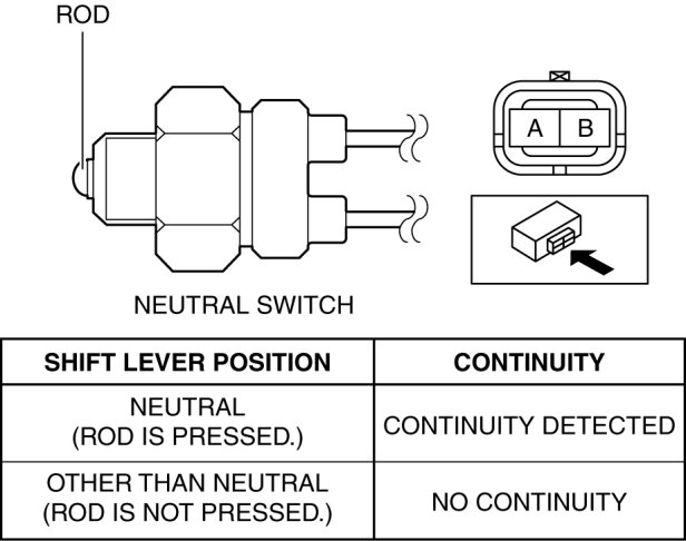 4. When the shift lever is in neutral and in a position other than neutral, verify that the continuity between neutral switch terminals A and B is according to the following table: