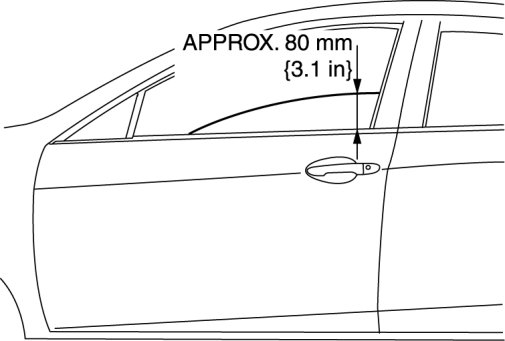 1. To access the glass installation bolt, position the front door glass so that the distance from the top of the front door glass to the upper part of the front beltline molding is approx. 80 mm {3.1 in}.