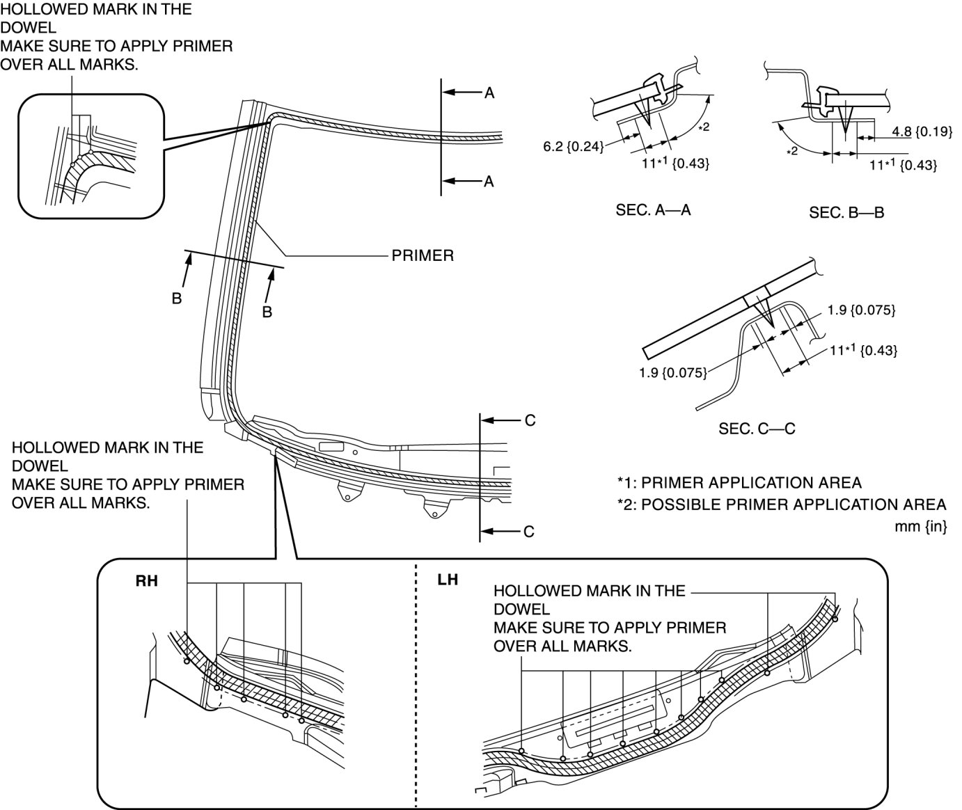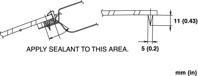 8. If the sealant has come off completely in any one place, apply some primer after degreasing, and allow it approx. 30 min to dry. Then apply 2 mm {0.08 in} thickness of new sealant.