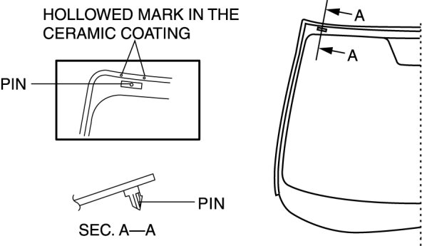 4. Align the alignment marks made before removal and install the pin to the windshield referring to the figure. (Reusing glass, pin removed)