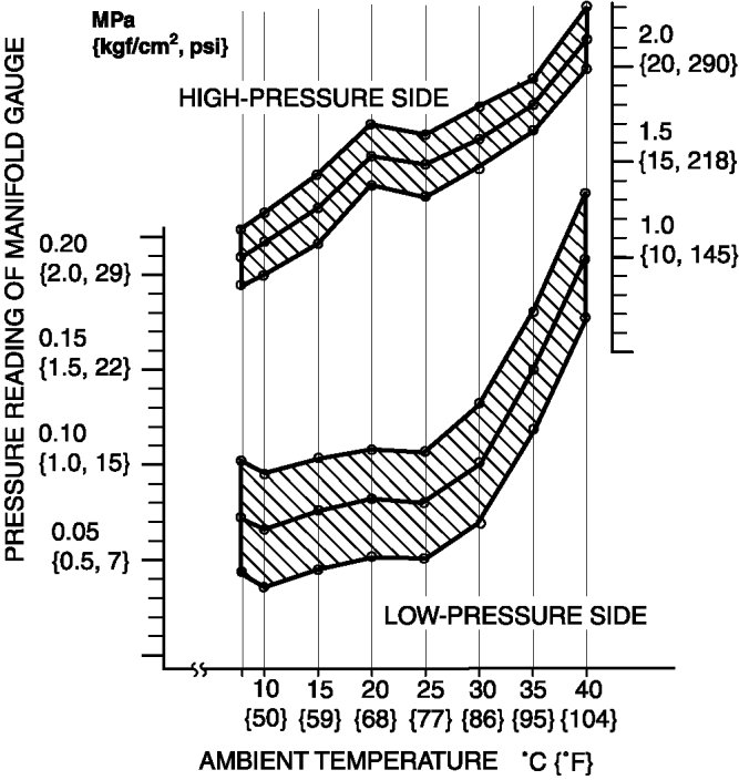 10. Verify that the intersection of the pressure reading of the manifold gauge and ambient temperature is in the shaded zone.