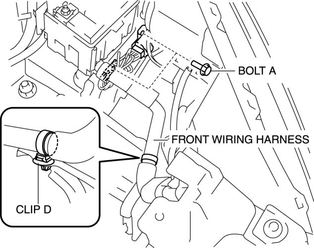 5. Remove ground terminal securing bolt A which branches from the front wiring harness, and clip D securing the front wiring harness.