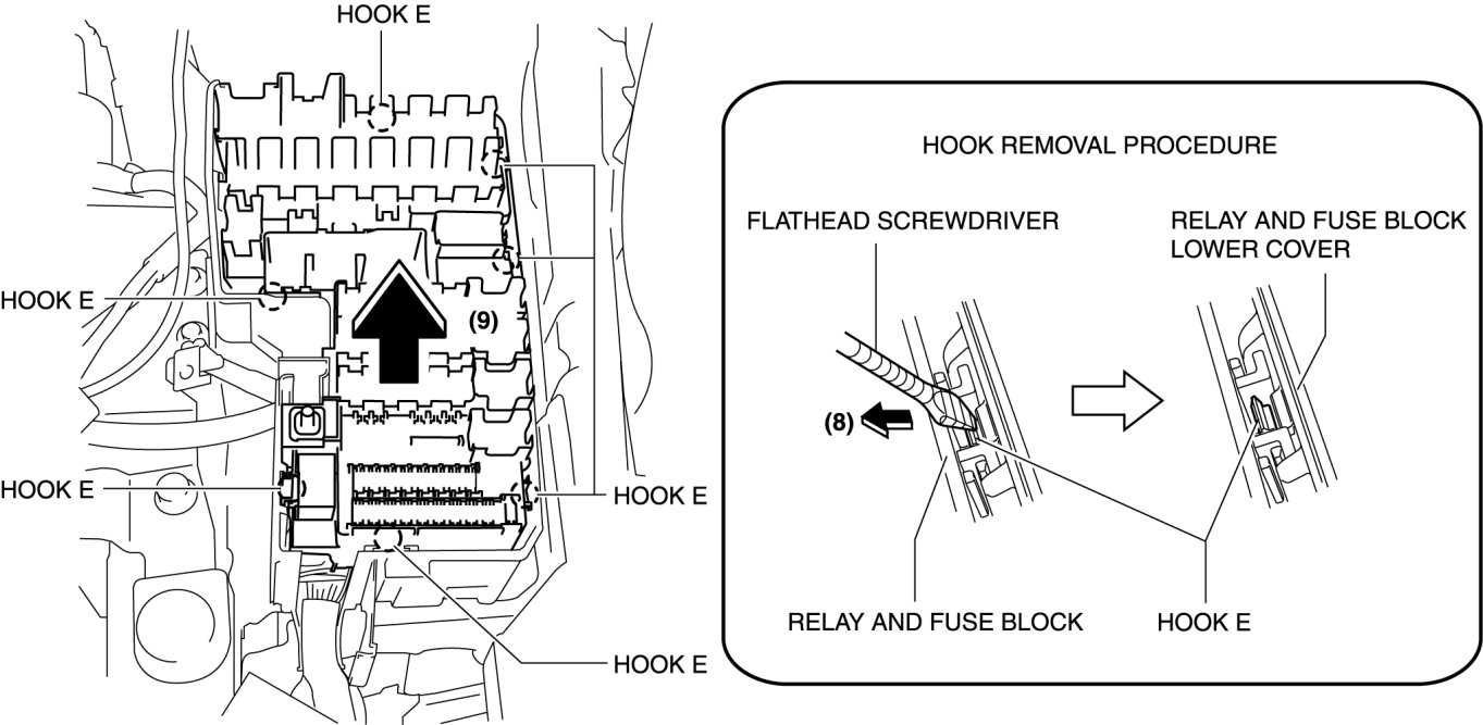 9. Using a flathead screwdriver or similar tool, lift up the relay and fuse block in the direction of the arrow (9) while pressing the hook E in the direction of the arrow (8) shown in the figure, and remove it.