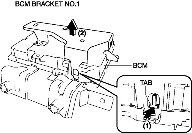 4. Press and release the tab in the direction of arrow (1) shown in the figure, and pull BCM bracket No.1 in the direction of arrow (2) shown in the figure to remove it from the BCM.