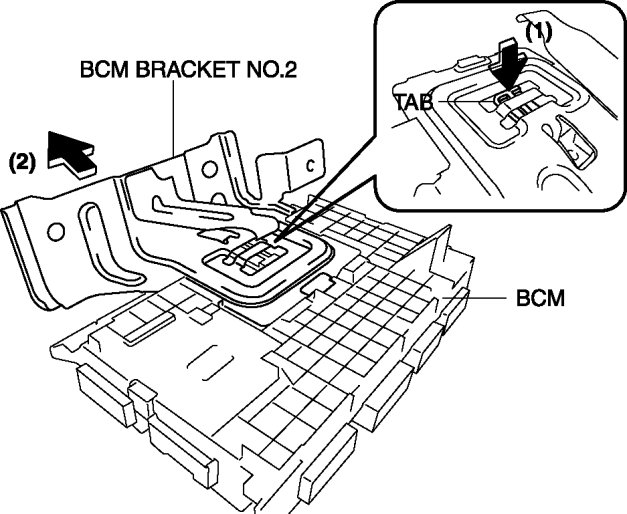 3. Press and release the tab in the direction of arrow (1) shown in the figure, and pull BCM bracket No.2 in the direction of arrow (2) shown in the figure to remove it from the BCM.