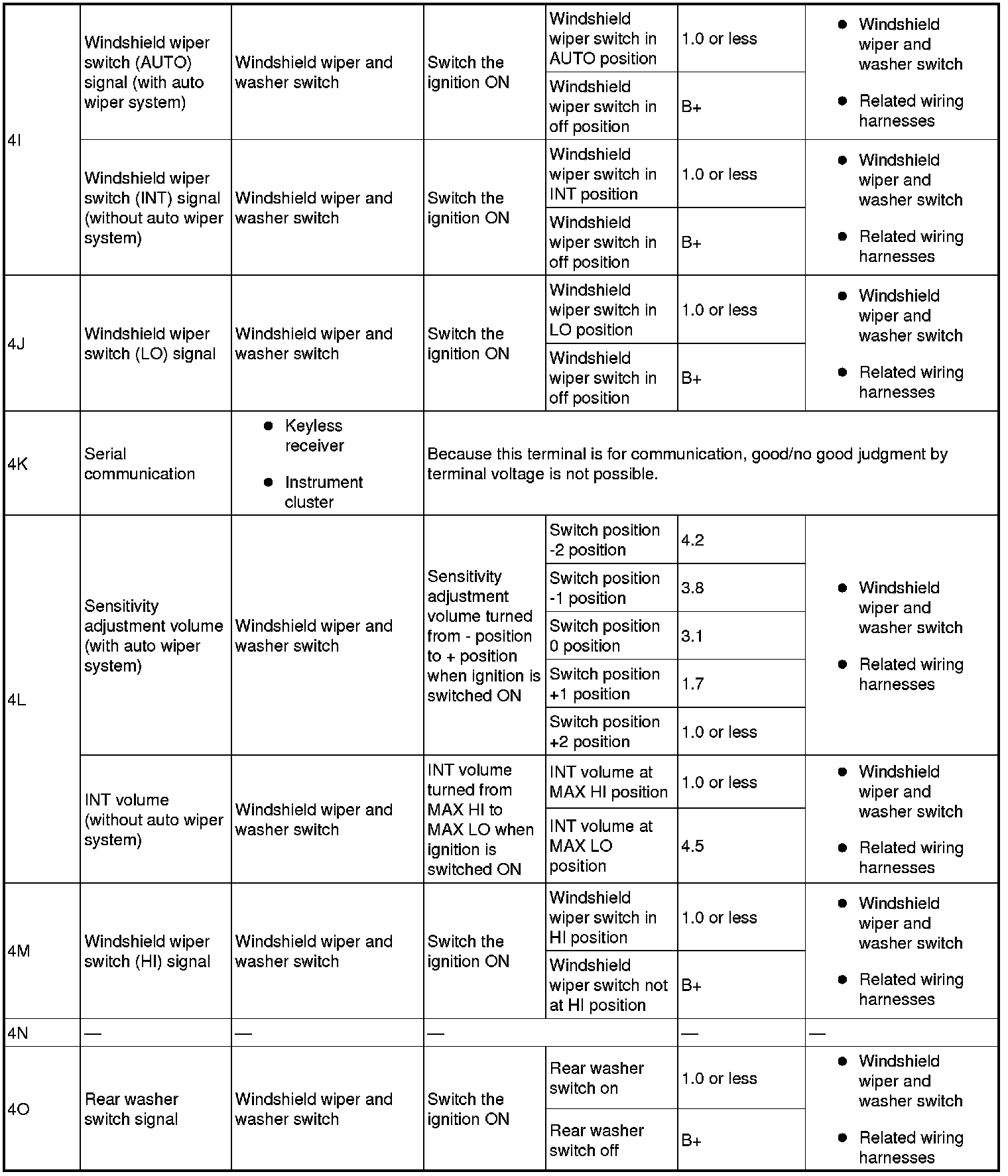 - If the voltage or continuity is not as specified in the Terminal Voltage Table, inspect the parts under "Inspection item (s)".