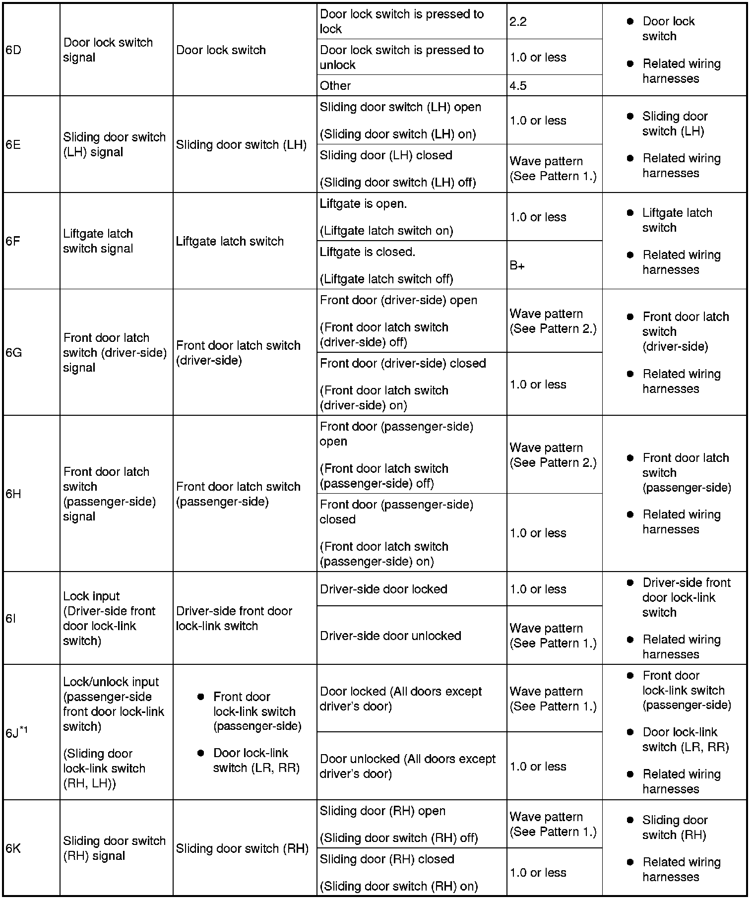 - Lock/unlock input (passenger-side front door lock-link switch) (sliding door lock link switch (RH, LH)): 6J (+) -> body ground (-)