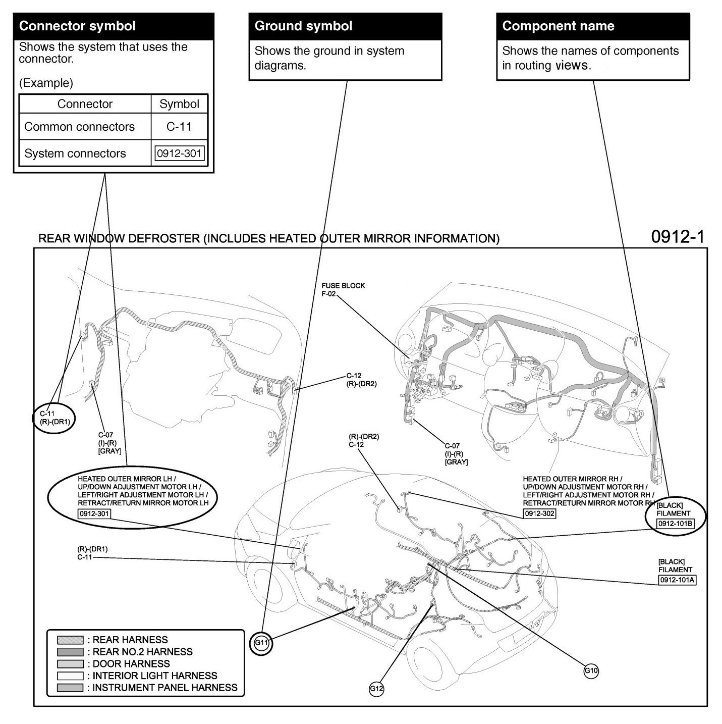 The routing view shows where electrical components are on the system circuit diagram by call out line and connector symbols.