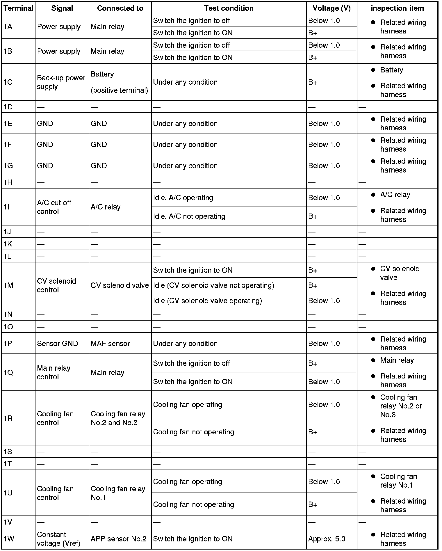 - The PCM terminal voltages vary with change in measuring conditions and vehicle conditions. Always carry out a total inspection of the input systems, output systems, and PCM to determine the cause of trouble. Otherwise, a wrong diagnosis will be made.