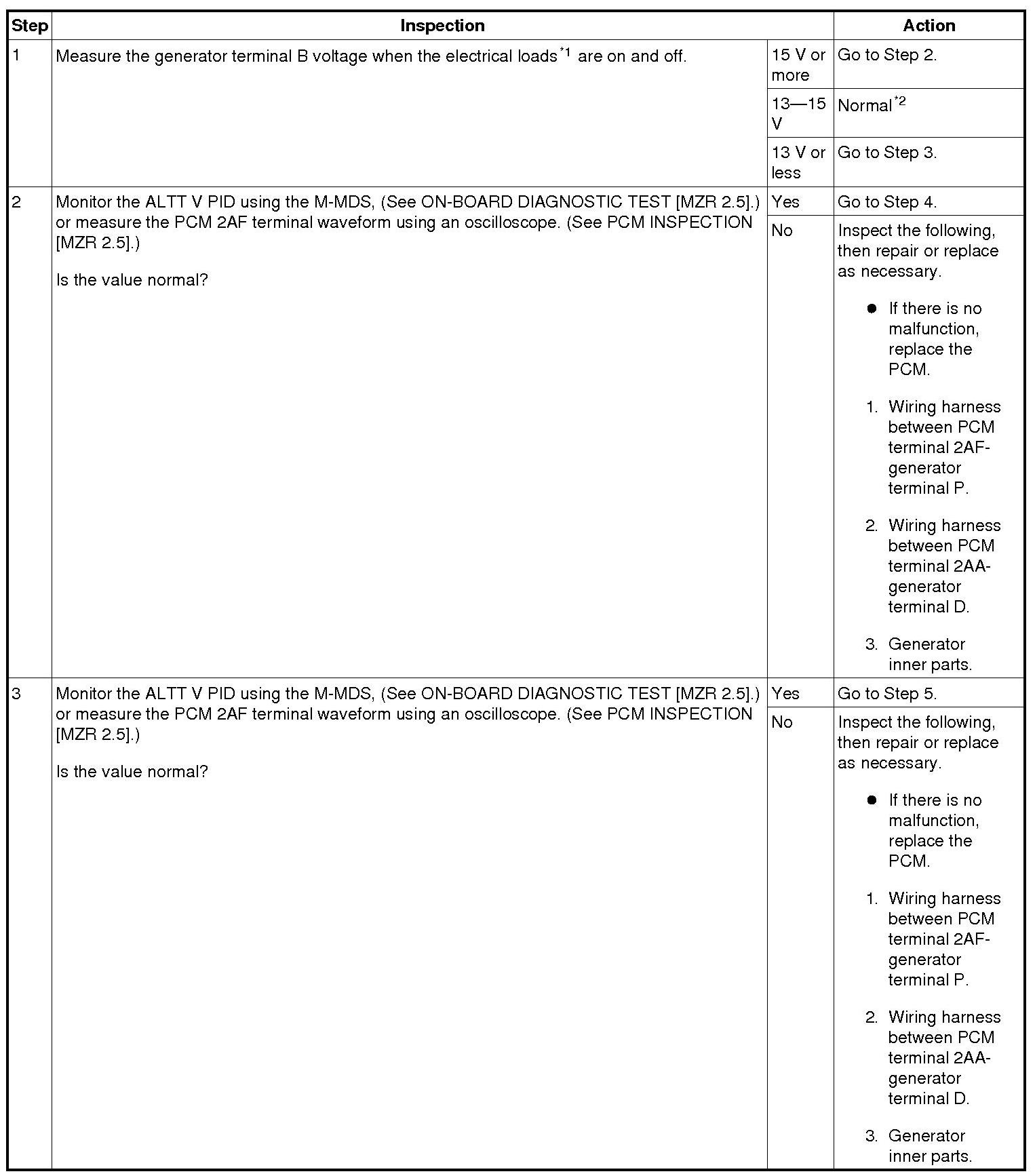 1 When the electrical load on the vehicle is low, the specified current cannot be verified although the generator is normal. In this case, increase the electrical load (Leave the headlights turned on for a while, then discharge the battery, or use a similar method.) and recheck.