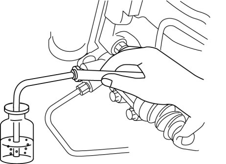 5. While the clutch pedal is being held down, the other person should loosen the bleeder screw using the commercially available flare nut wrench, and bleed any fluid containing air bubbles. Once completed, tighten the bleeder screw.