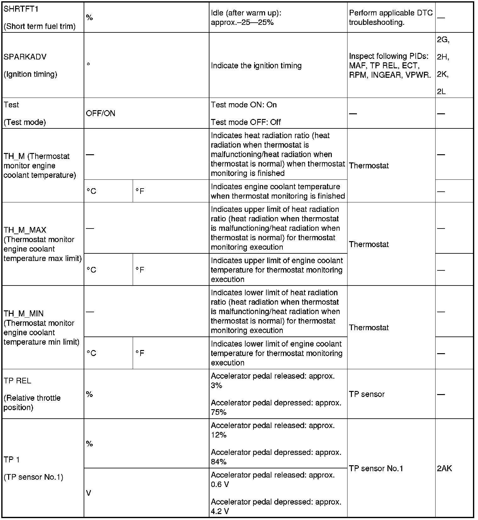 - PIDs for the following parts are not available on this model. Go to the appropriate part inspection.