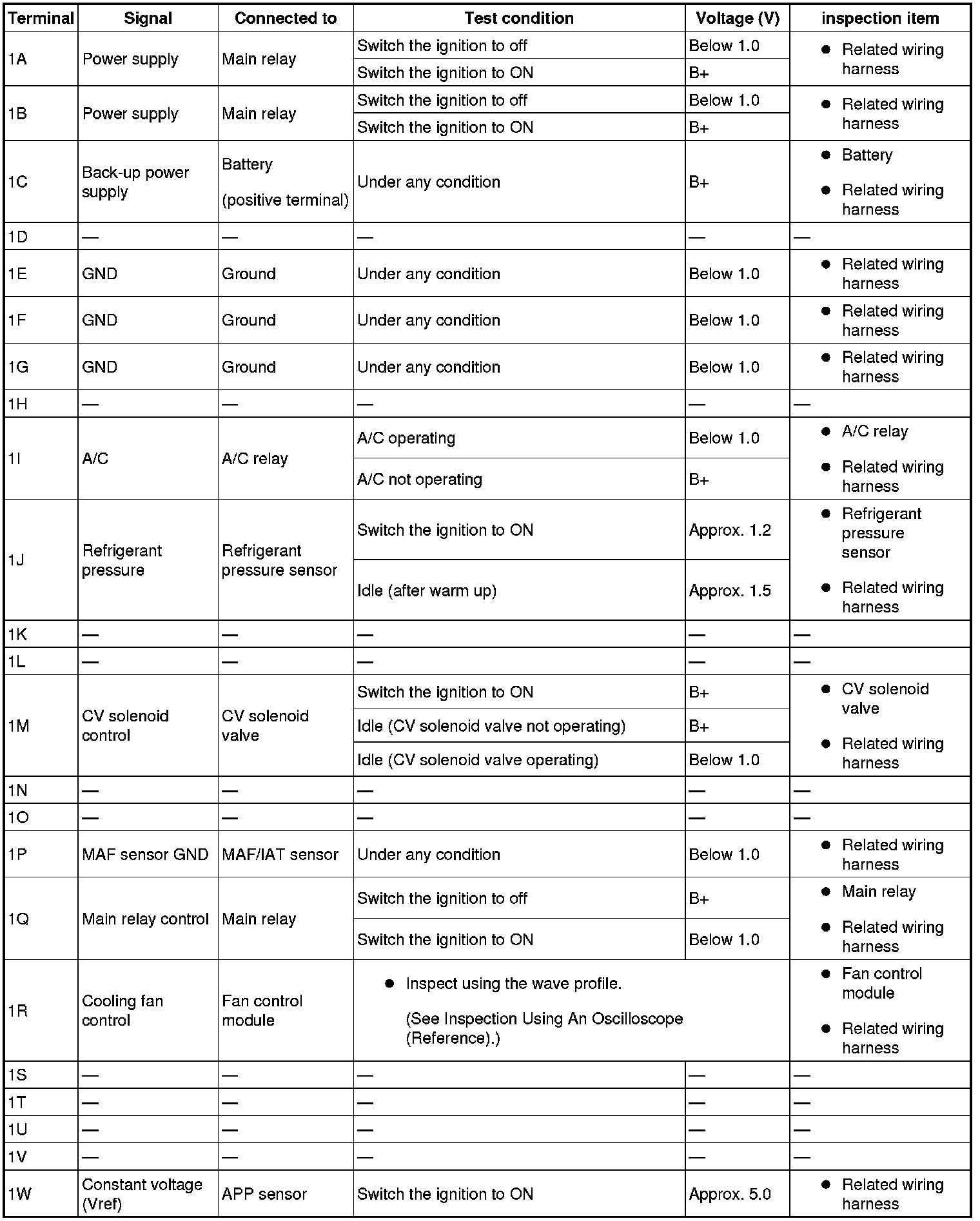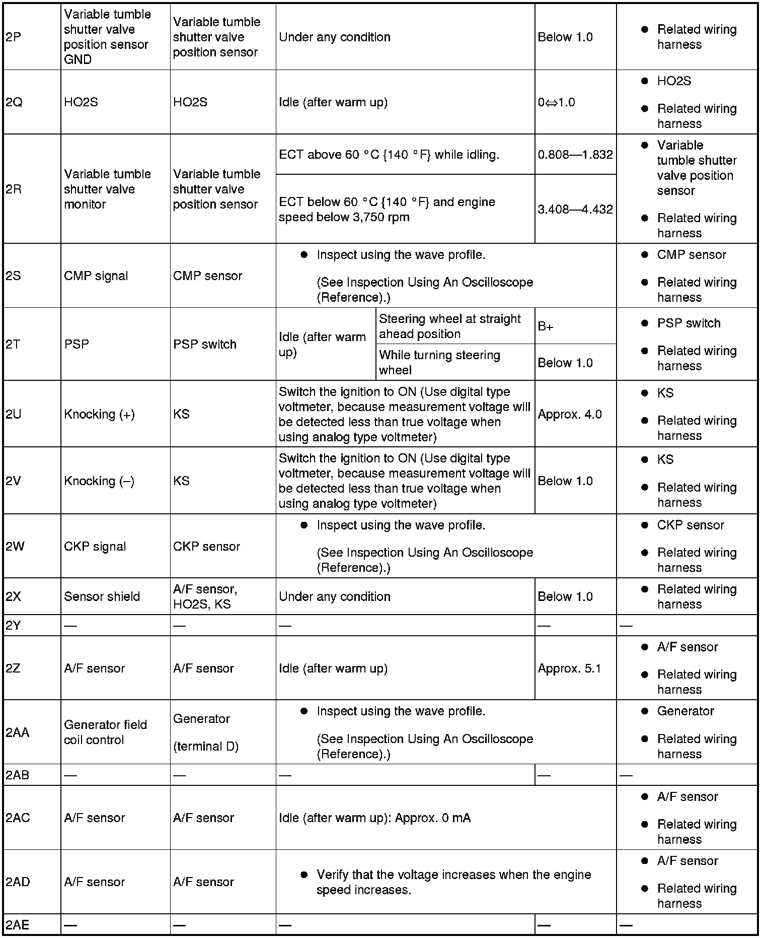 - The PCM terminal voltages vary with change in measuring conditions and vehicle conditions. Always carry out a total inspection of the input systems, output systems, and PCM to determine the cause of trouble. Otherwise, a wrong diagnosis will be made.