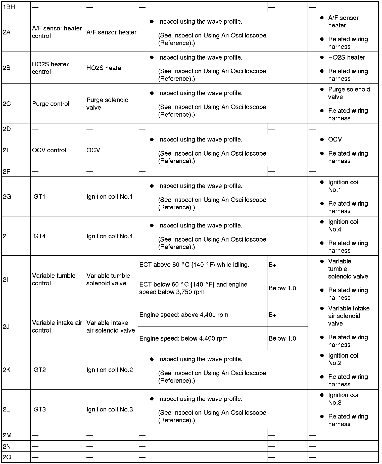 - IGT2(ignition coil No.2): 2K(+)-body ground(-)