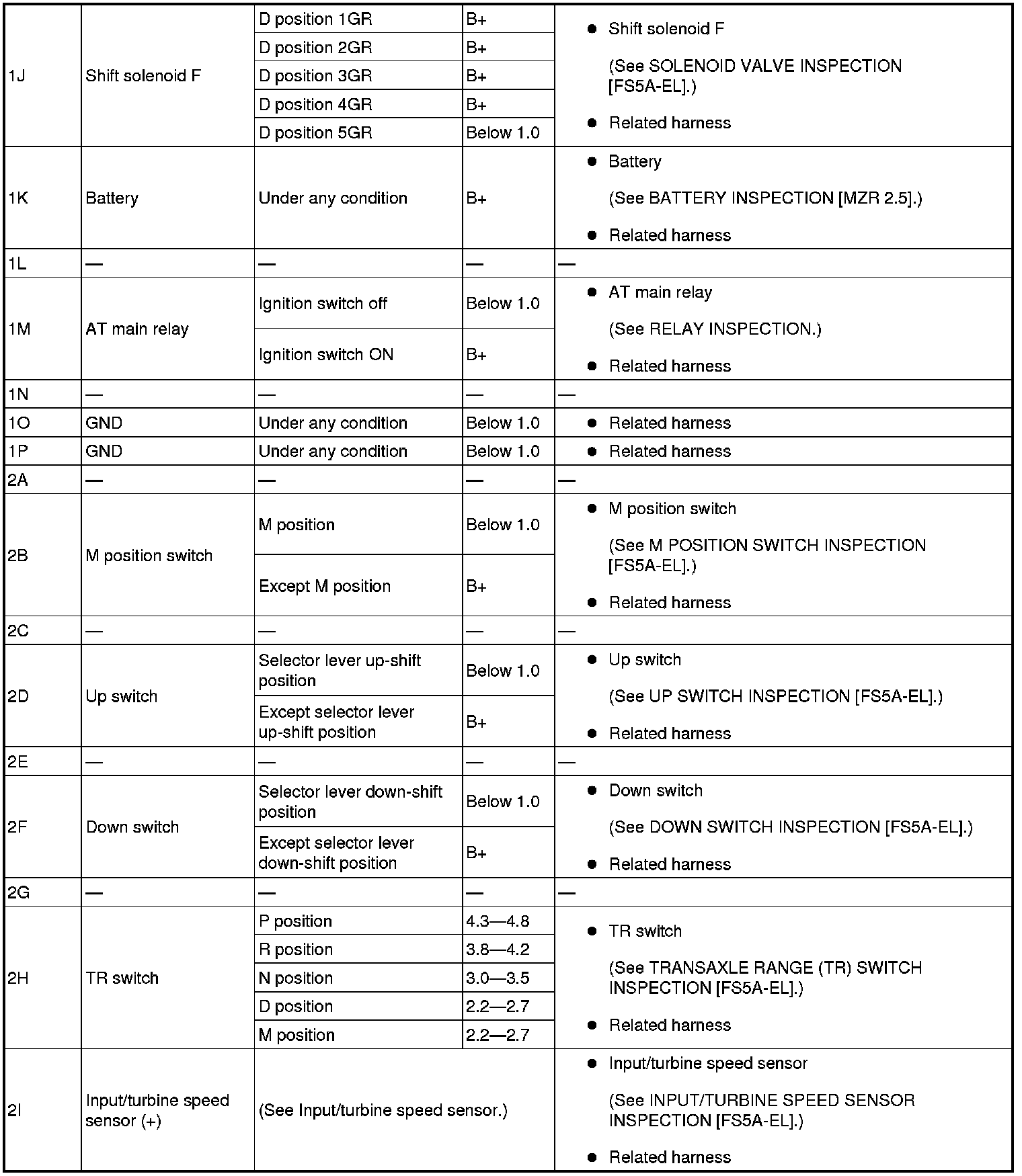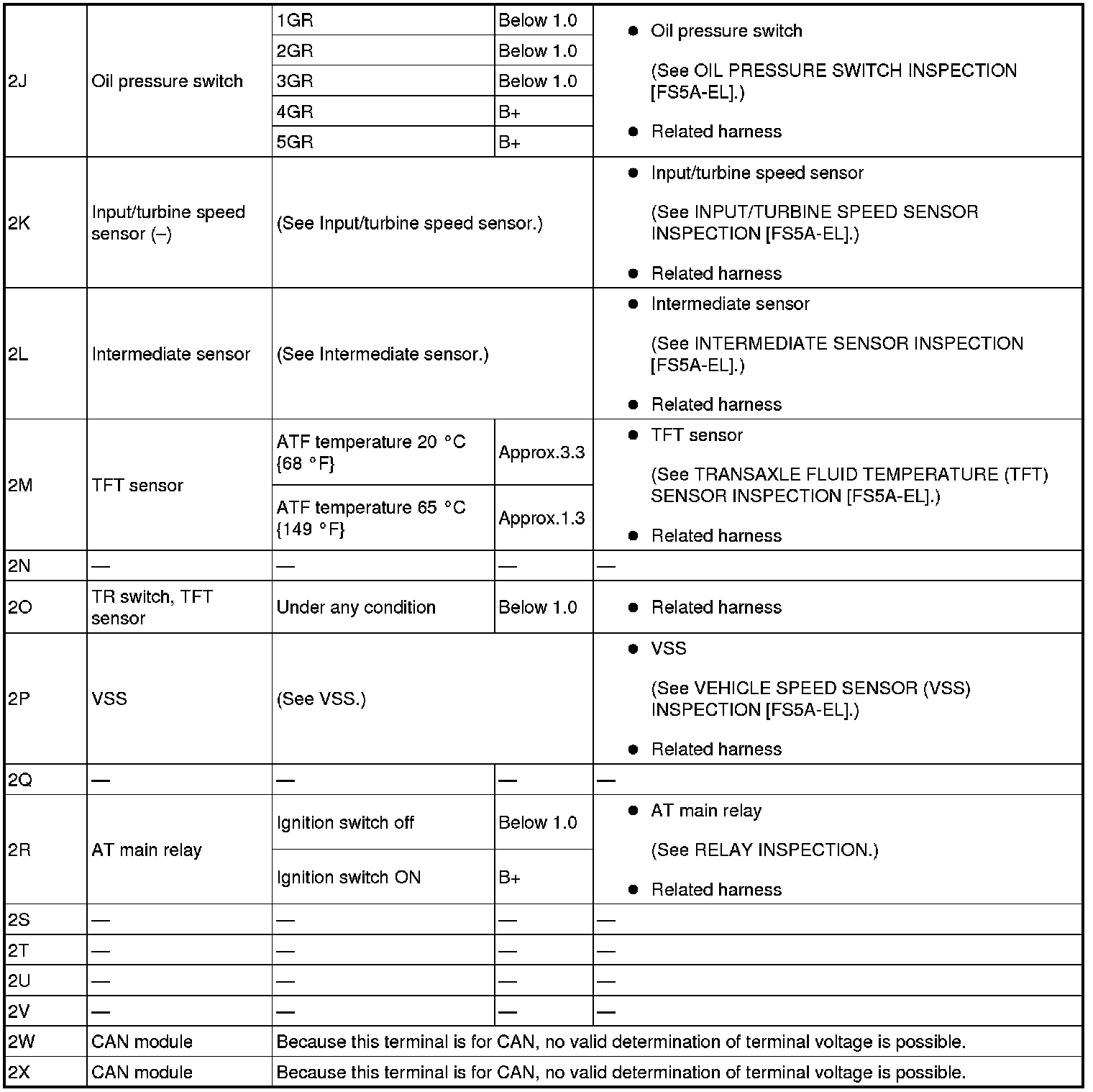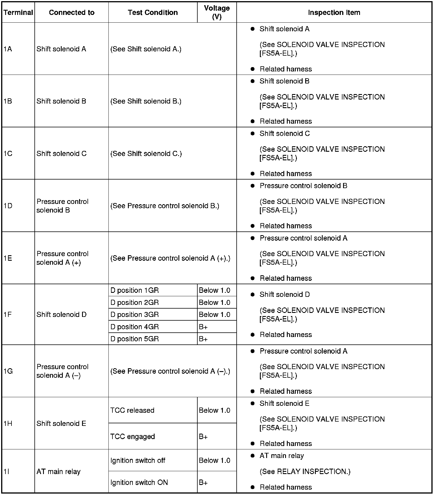 - If any incorrect voltage is detected, inspect the related system(s), wiring harnesses and connector(s) referring to the "Inspection Item" column in the "TCM Terminal Voltage".