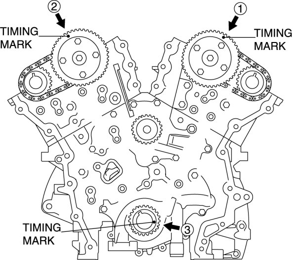 Timing Component Alignment Marks1. Align the alignment marks on the camshaft timing chain and both intake and exhaust side camshaft sprockets of both banks.