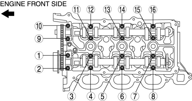 Install the RH bank camshaft caps and temporarily tighten the camshaft cap bolts evenly in the order shown in several passes.