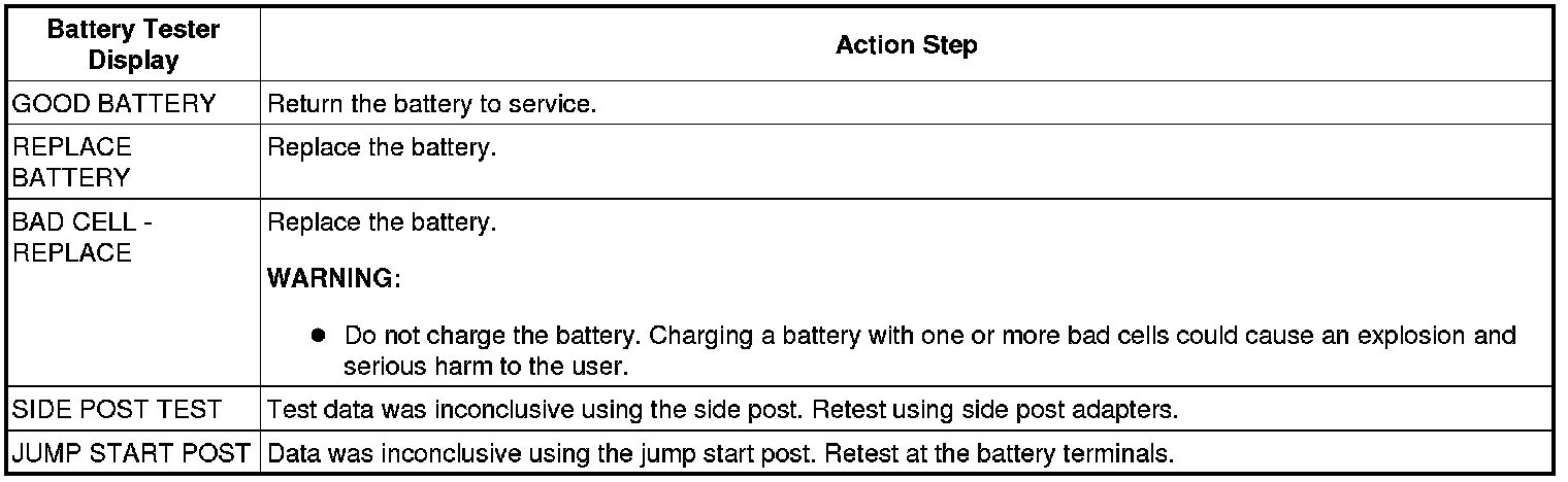 6. After the charging is completed, the Mazda GR8-1291 will print out the diagnostic charging results and display one of the following results listed below. Review the results and follow the action step for the displayed result.